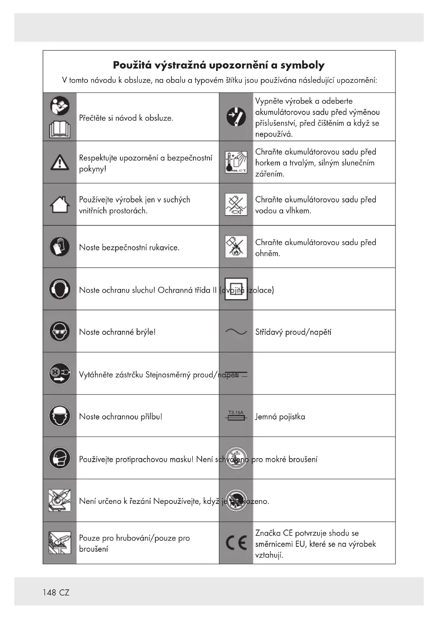 Chraňte akumulátorovou sadu před horkem a trvalým, silným slunečním zářením. Používejte výrobek jen v suchých vnitřních prostorách. Chraňte akumulátorovou sadu před vodou a vlhkem. Noste bezpečnostní rukavice. Chraňte akumulátorovou sadu před ohněm. Noste ochranu sluchu! Ochranná třídaII (dvojitá izolace) Noste ochranné brýle! Střídavý proud/napětí Vytáhněte zástrčku Stejnosměrný proud/napětí Noste ochrannou přilbu! T3.15A Jemná pojistka Používejte protiprachovou masku! Není schváleno pro mokré broušení Není určeno k řezání Nepoužívejte, když je poškozeno. Pouze pro hrubování/pouze pro broušení Značka CE potvrzuje shodu se směrnicemi EU, které se na výrobek vztahují.149