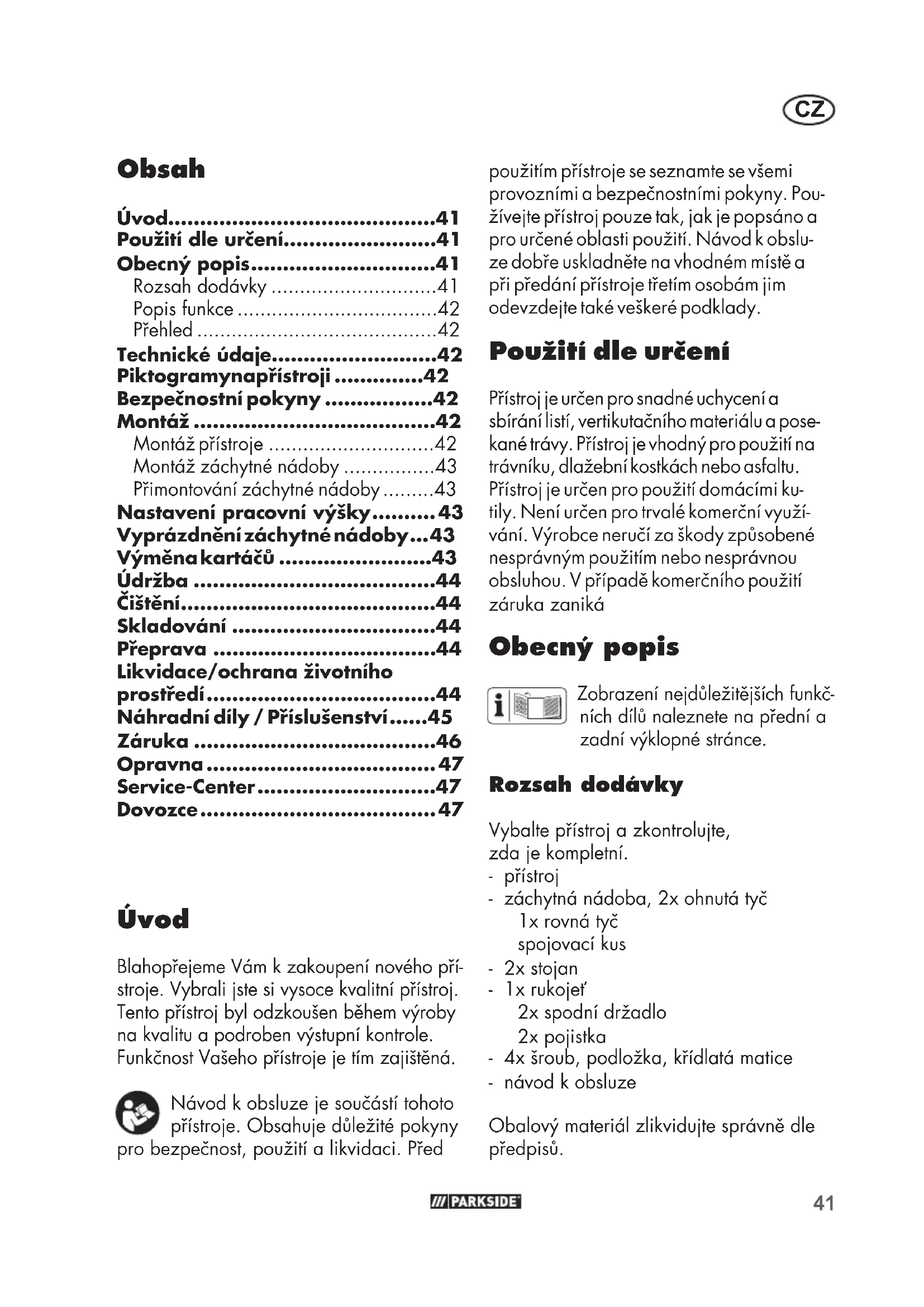 - Dovozce použitím přístroje se seznamte se všemi provozními a bezpečnostními pokyny. Pou- žívejte přístroj pouze tak, jak je popsáno a pro určené oblasti použití. Návod k obslu- ze dobře uskladněte na vhodném místě a při předání přístroje třetím osobám jim odevzdejte také veškeré podklady. Použití dle určení Přístroj je určen pro snadné uchycení a sbírání listí, vertikutačního materiálu a pose- kané trávy. Přístroj je vhodný pro použití na trávníku, dlažební kostkách nebo asfaltu. Přístroj je určen pro použití domácími ku- tily. Není určen pro trvalé komerční využí- vání. Výrobce neručí za škody způsobené nesprávným použitím nebo nesprávnou obsluhou. V případě komerčního použití záruka zaniká Obecný popis Zobrazení nejdůležitějších funkč- ních dílů naleznete na přední a zadní výklopné stránce. Rozsah dodávky Vybalte přístroj a zkontrolujte, zda je kompletní. - přístroj - záchytná nádoba, 2x ohnutá tyč 1x rovná tyč spojovací kus - 2x stojan - 1x rukojeť 2x spodní držadlo 2x pojistka - 4x šroub, podložka, křídlatá matice - návod k obsluze Obalový materiál zlikvidujte správně dle předpisů. Úvod Blahopřejeme Vám kzakoupení nového pří- stroje. Vybrali jste si vysoce kvalitní přístroj. Tento přístroj byl odzkoušen během výroby na kvalitu a podroben výstupní kontrole. Funkčnost Vašeho přístroje je tím zajištěná. Návod kobsluze je součástí tohoto přístroje. Obsahuje důležité pokyny pro bezpečnost, použití a likvidaci. Před42 p. 47