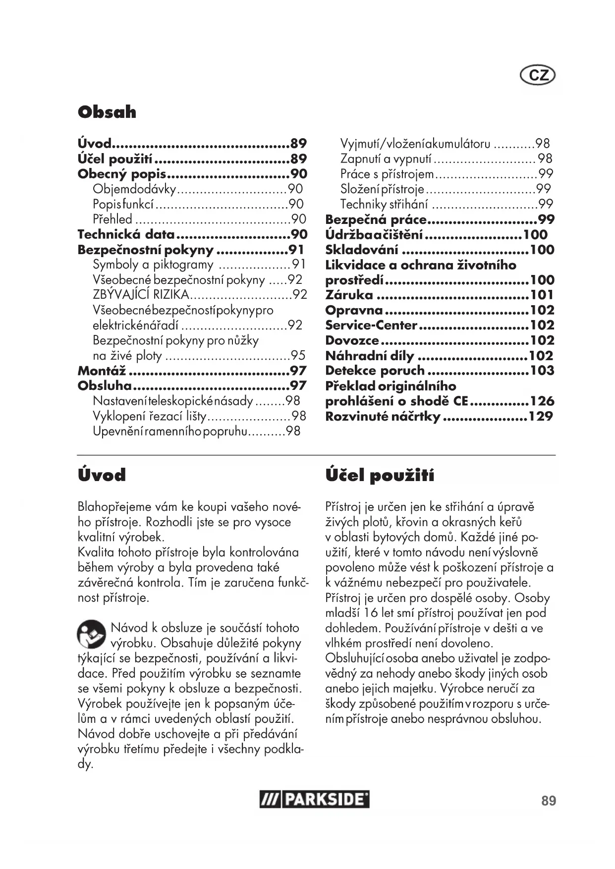- Rozvinuté náčrtky Účel použití Přístroj je určen jen ke střihání a úpravě živých plotů, křovin a okrasných keřů v oblasti bytových domů. Každé jiné po- užití, které v tomto návodu není výslovně povoleno může vést k poškození přístroje a k vážnému nebezpečí pro použivatele. Přístroj je určen pro dospělé osoby. Osoby mladší 16 let smí přístroj používat jen pod dohledem. Používání přístroje v dešti a ve vlhkém prostředí není dovoleno. Obsluhující osoba anebo uživatel je zodpo- vědný za nehody anebo škody jiných osob anebo jejich majetku. Výrobce neručí za škody způsobené použitím v rozporu s urče- ním přístroje anebo nesprávnou obsluhou.90 p. 129