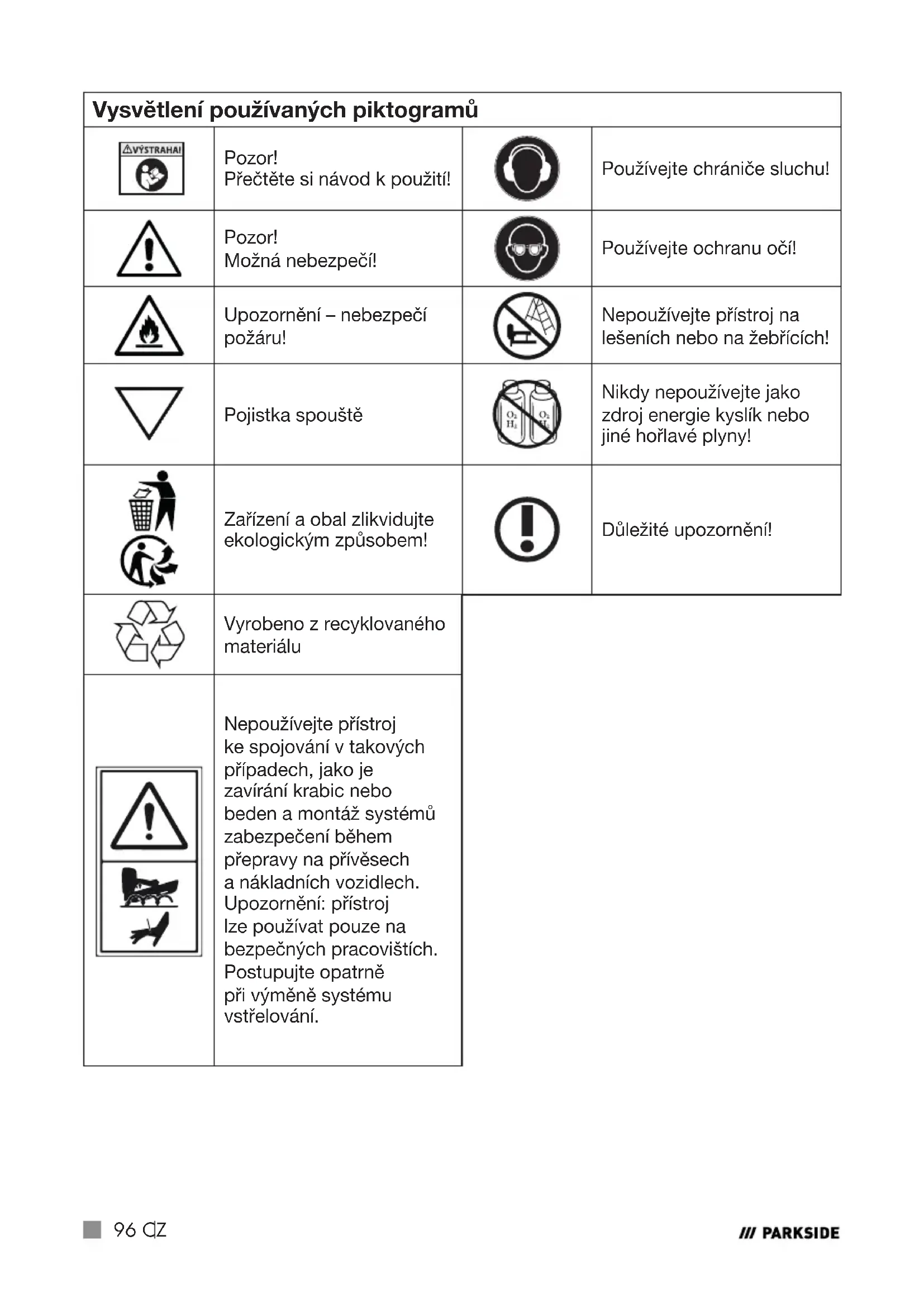z Aktivační systém NEBEZPEČÍ ÚRAZU! Nepoužívejte na lešeních nebo na žebřících! Zarážecí nářadí, které je vybaveno kontaktním akti- vačním systémem, musí být označeno symbolem „Nepo- užívat na lešeních nebo žeb- řících“. Tyto přístroje nesmějí být pro určité činnosti pou- žívány, například: přechod zjednoho místa montáže na jiné přes lešení, schody, žeb- říky nebo žebříkům podobné konstrukce, jako jsou např. střešní latě, zavírání beden nebo obalů, instalace prvků kzajištění před poškozením 494747_2504_Drucklufttacker_LB8_content.indb 107494747_2504_Drucklufttacker_LB8_content.indb 107 13.08.2025 13:34:0013.08.2025 13:34:00108 CZ během přepravy, např. na vozidlech a vagónech. z Další pokyny pro zarážecí nářadí spneumatickým pohonem NEBEZPEČÍ ÚRAZU! Pokud došlo kodstranění pojistky spouště