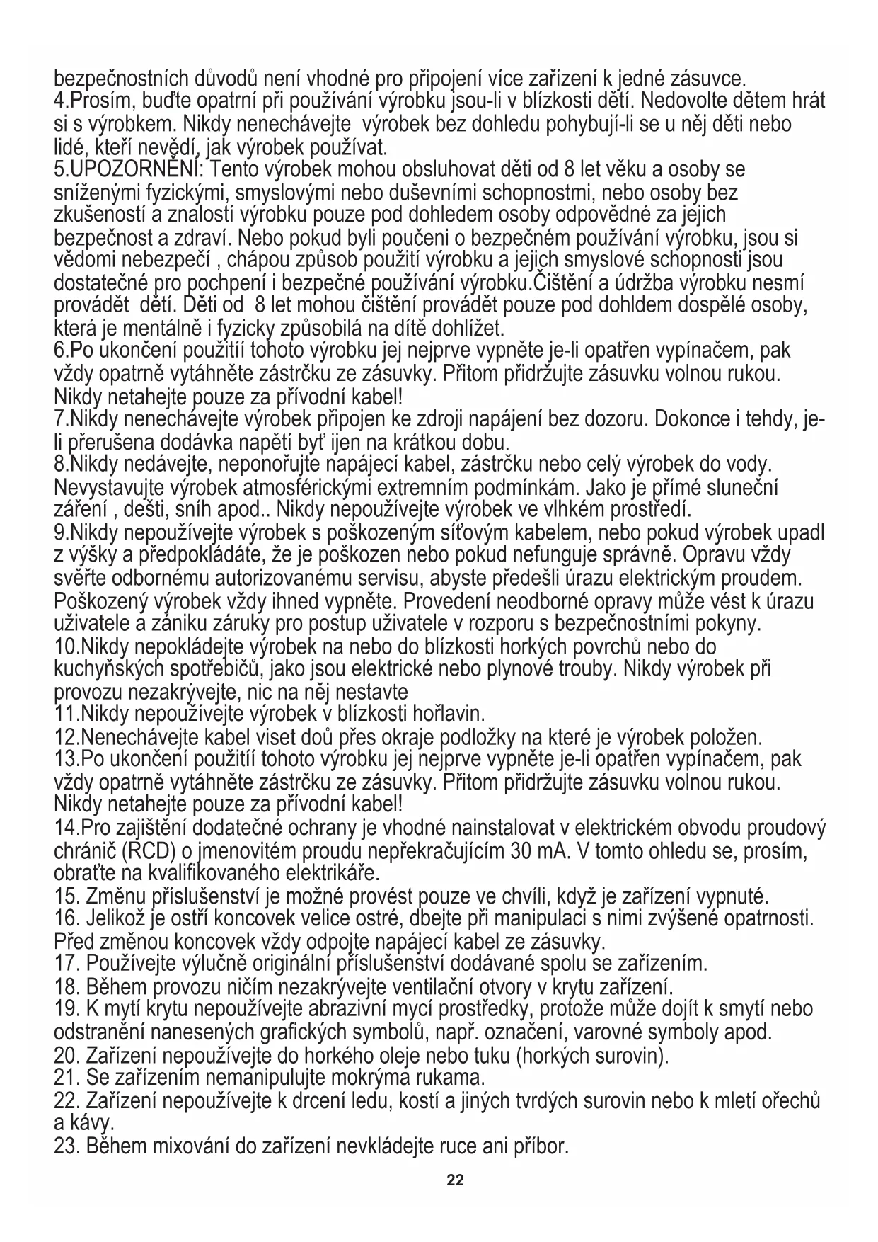 22. Zařízení nepoužívejte k drcení ledu, kostí a jiných tvrdých surovin nebo k mletí ořechů