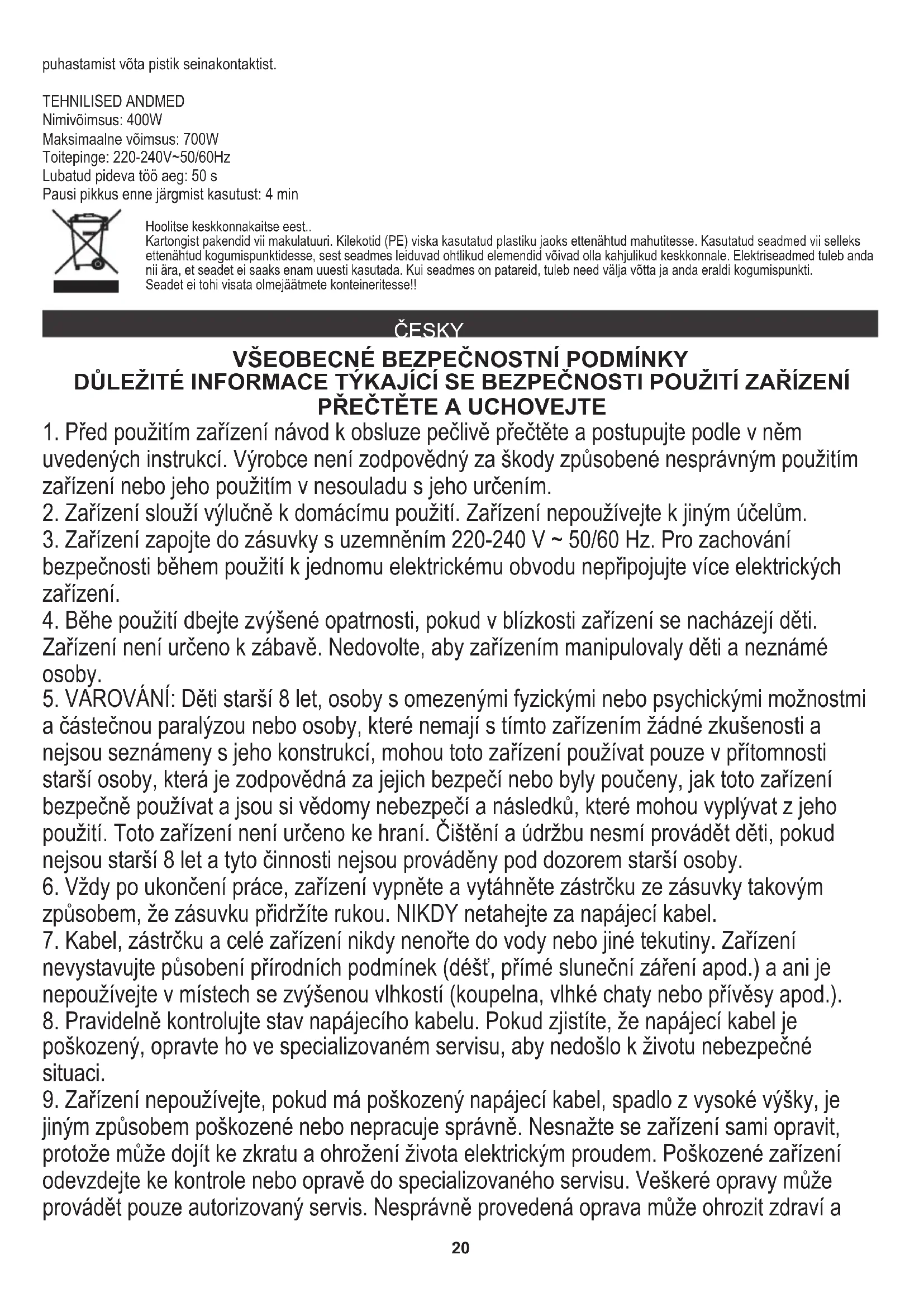 destinației sale. Přístroj nevyhazujte do popelnic ani kontejneru na směsný odpad!! Ochrana životního prostředí. Kartón odevzdejte do sběru. Polyetylénové sáčky (PE) vyhazujte do kontejneru na plasty. Vysloužilý přístroj odevzdejte do příslušného sběrného dvoru, protože některé části zařízení mohou představovat pro životní prostředí nebezpečí. Elektrický přístroj odevzdejte tak, aby se omezilo jeho opětovné používání. Pokud jsou v přístroji baterie, vyjměte je a odevzdejte do příslušného sběrného místa zvlášť. ROMÂNĂ 5. Některé druhy zeleniny, např. mrkev, mohou na zařízení zanechat barevné skvrny. K jejich odstranění použijte hadřík navlhčený rostlinným olejem. Maximální čas provozu: 50 s POZOR! Korpus s motorem (4) chraňte před namočením. Nemyjte ho v myčce na nádobí, ani pod tekoucí vodou. Než zařízení otřete navlhčeným hadříkem, odpojte ho od zdroje napájení. TECHNICKÉ ÚDAJE Napájecí napětí: 220-240V~50/60Hz Minimální pauza před dalším použitím: 4 min