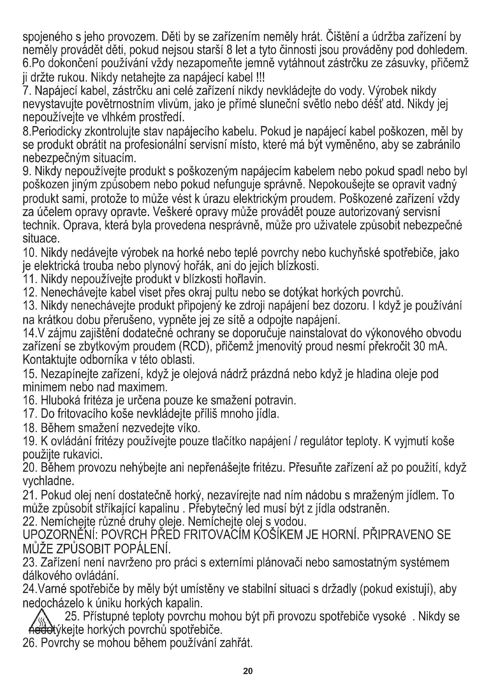 20. Během provozu nehýbejte ani nepřenášejte fritézu. Přesuňte zařízení až po použití, když