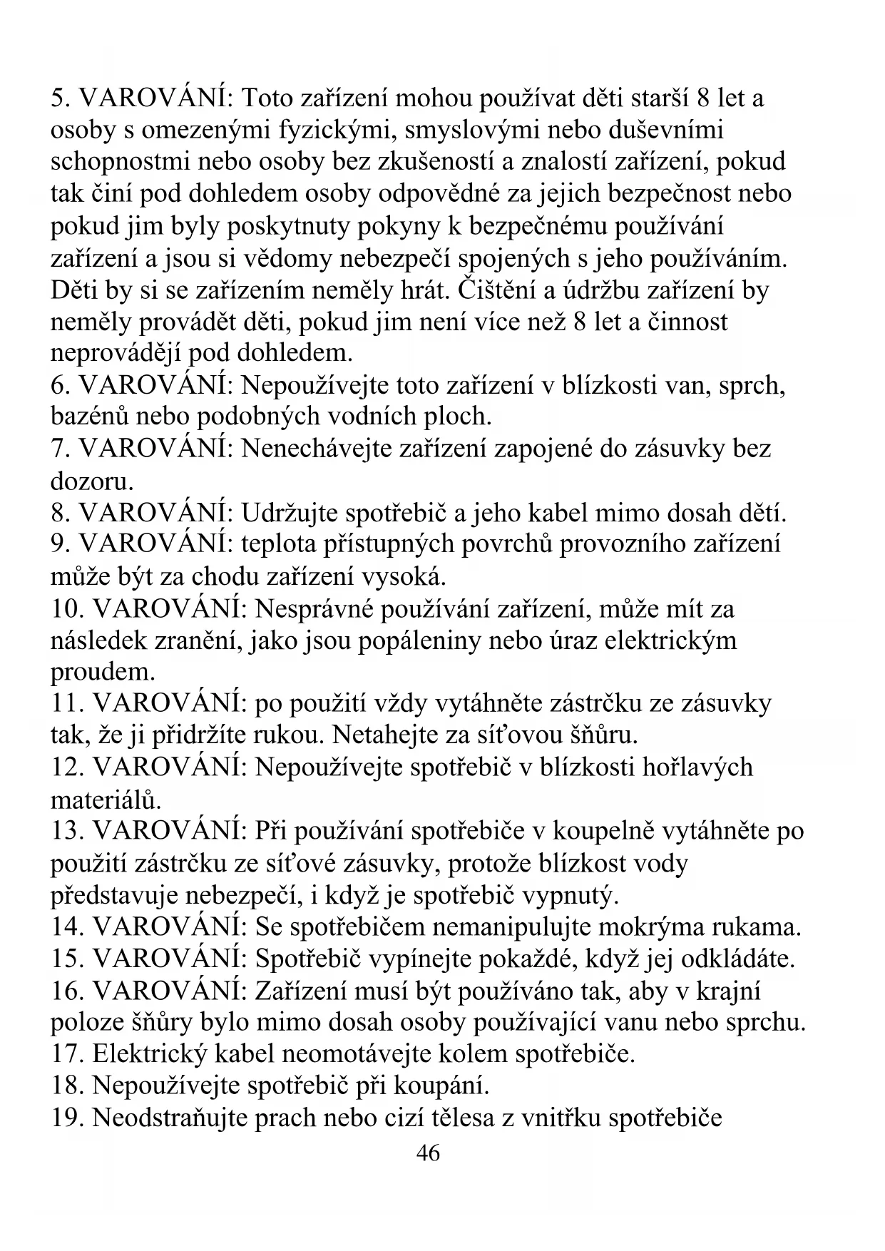 18. Nepoužívejte spotřebič při koupání.