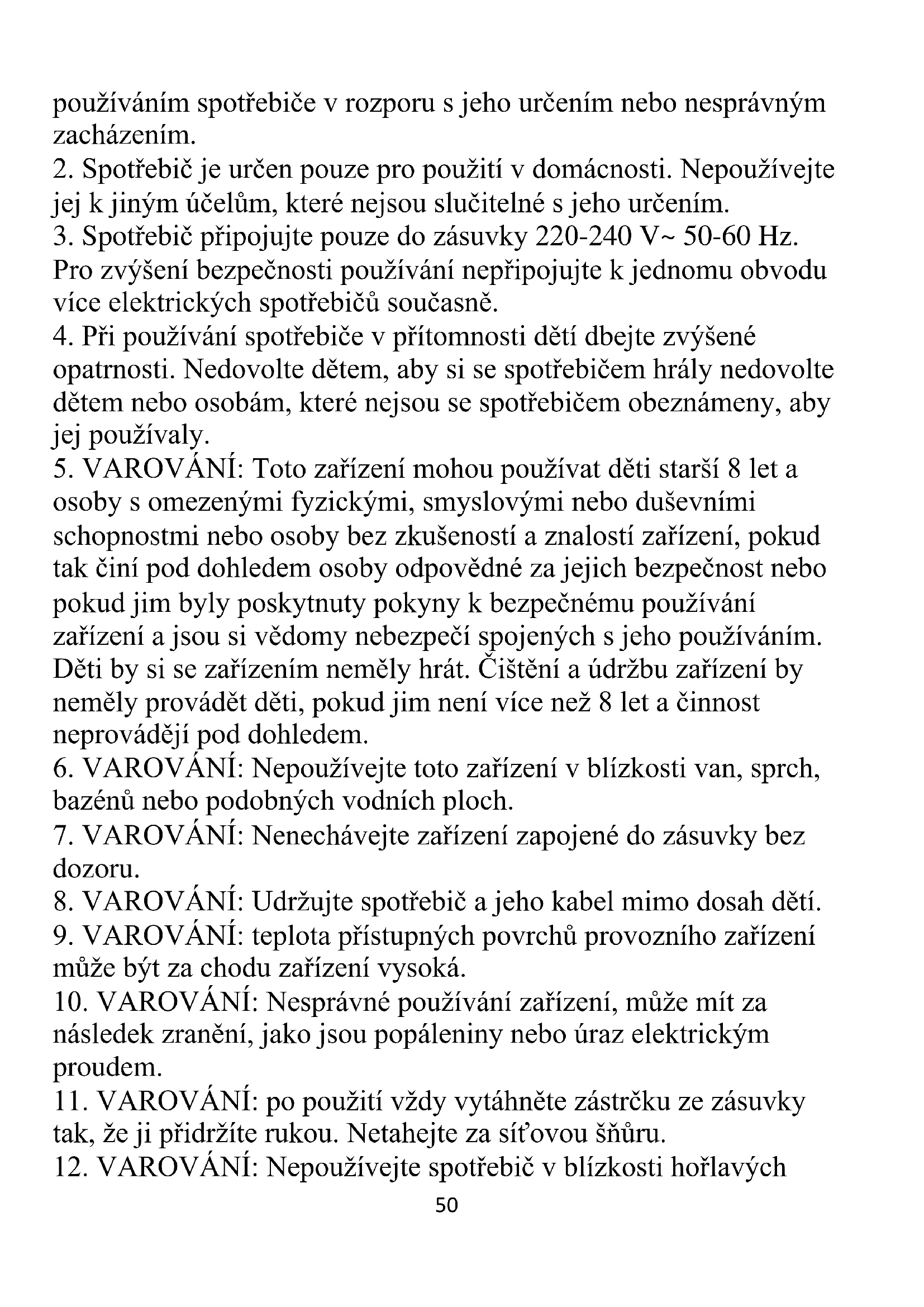 pokyny v něm uvedené. Výrobce neodpovídá za škody způsobené50 používáním spotřebiče v rozporu s jeho určením nebo nesprávným zacházením.