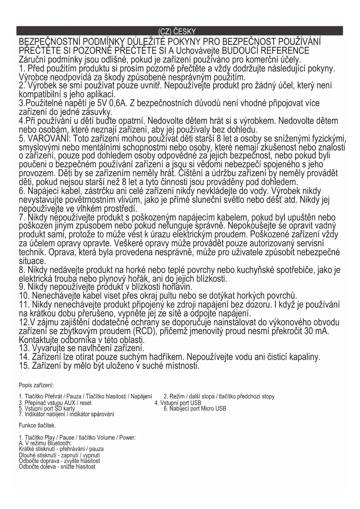 Zařízení má na indikátoru dvě barvy ikon Blikající modré světlo ukazuje, že se zařízení páruje Modré světlo je stabilní a svítí. Zařízení je připojeno k jinému zařízení přes Bluetooth. Červené stabilní světlo. Zařízení se nabíjí. Odstraňování problémů: Problém: Zařízení se nepřipojuje přes Bluetooth, zařízení se v seznamu nezobrazuje. Řešení: Zkontrolujte, zda je zařízení AD 1185 nastaveno na režim Bluetooth a není připojeno k jinému zařízení. Zkontrolujte, zda zadní strana AD 1185 bliká nebo je modrá barva stabilní. Pokud je stabilní. Zařízení je připojeno k jinému zařízení. Pokud bliká a vyhledává, zkontrolujte, zda je váš telefon / počítač / zařízení kompatibilní s Bluetooth verze 4.0. Problém: Zařízení se nespustí v režimu USB / SD. Řešení: Zkontrolujte, zda zařízení USB pracuje na jiném čtečce USB. Pokud ano, zkontrolujte prosím, zda je formát souboru nastaven na FAT 32. Pokud ne, přeformátujte zařízení USB / SD na formát FAT32. Pokud zařízení stále nečte, zkontrolujte, zda jsou soubory na USB / SD ve formátu Mp3. Technické specifikace: Výstupní výkon: 6W Vstupní výkon: DC 5V 0,6A Verze Bluetooth: 4.0. Podpora souborů: Mp3 Baterie: 1800 mAh 3,7 V Typ baterie: Lithium. Hlasitý reproduktor: 2x5W Maximální výkon: 20 W FM: 87,5 - 108 MHz Prohlášení CE: https://adler.com.pl/dane/CE/ADLER/ad_ 1185.pdf Ochrana životního prostředí. Kartón odevzdejte do sběru. Polyetylénové sáčky (PE) vyhazujte do kontejneru na plasty. Vysloužilý přístroj odevzdejte do příslušného sběrného dvoru, protože některé části zařízení mohou představovat pro životní prostředí nebezpečí. Elektrický přístroj odevzdejte tak, aby se omezilo jeho opětovné používání. Pokud jsou v přístroji baterie, vyjměte je a odevzdejte do příslušného sběrného místa zvlášť. Přístroj nevyhazujte do popelnic ani kontejneru na směsný odpad!! (RU) РУССКИЙ(RU) РУССКИЙ УСЛОВИЯ БЕЗОПАСНОСТИ ВАЖНЫЕ ИНСТРУКЦИИ ПО БЕЗОПАСНОСТИ ИСПОЛЬЗОВАНИЯ ПОЖАЛУЙСТА, ПРОЧИТАЙТЕ ВНИМАТЕЛЬНО И СОХРАНИТЕ ДЛЯ ИСПОЛЬЗОВАНИЯ В БУДУЩЕМ Условия гарантии иные, если устройство используется в коммерческих целях.