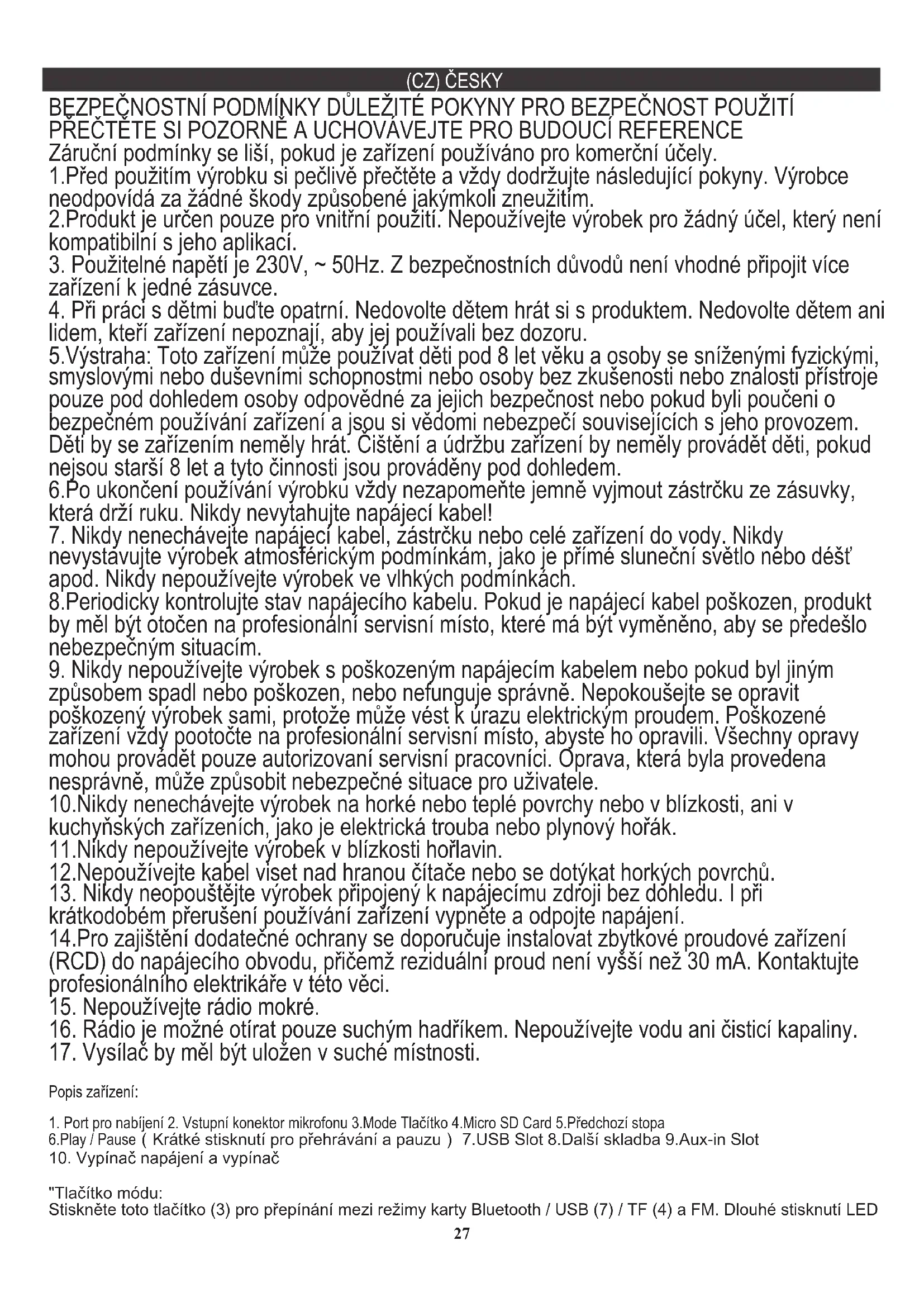 "Tlačítko módu: Stiskněte toto tlačítko (3) pro přepínání mezi režimy karty Bluetooth / USB (7) / TF (4) a FM. Dlouhé stisknutí LED 27diod se zapne / vypne. Možnosti USB / TF jsou k dispozici pouze po vložení Pendrive (USB) nebo TF (SD karty) do zařízení. Připojení Bluetooth: Posuňte vypínač (10) do polohy ON. Bliká modrý indikátor BT reproduktoru. Vyhledejte „AD1169“ na svém mobilu a vyberte jej, jakmile ho najdete. Po úspěšném připojení reproduktoru k mobilnímu telefonu přestane blikat indikátor BT. AUX Zapojte jeden konec audio kabelu (mini jack 3,5 mm) do reproduktoru a druhý konec do mobilního telefonu nebo jiného audio zařízení. FM rádio: Pro přepnutí do režimu FM stiskněte tlačítko režimu. Stiskněte a podržte tlačítko Play / Pause na několik sekund, pak jej uvolněte a znovu stiskněte pro spuštění automatického vyhledávání. Modrý indikátor bude blikat, jakmile režim hledání dokončí svůj úkol. Stiskněte Next pro procházení stanicemi. Opětovným stisknutím tlačítka režimu režim FM opustíte. Maximální podpora paměti pro kartu SD: 32 GB. Formát FAT Výkon: 4,2W Max: 30W Vstup: 5V Ovladač: 4 palcový reproduktor Kapacita baterie: 1200mAh Přenosová vzdálenost: 10M Ochrana životního prostředí. Kartón odevzdejte do sběru. Polyetylénové sáčky (PE) vyhazujte do kontejneru na plasty. Vysloužilý přístroj odevzdejte do příslušného sběrného dvoru, protože některé části zařízení mohou představovat pro životní prostředí nebezpečí. Elektrický přístroj odevzdejte tak, aby se omezilo jeho opětovné používání. Pokud jsou v přístroji baterie, vyjměte je a odevzdejte do příslušného sběrného místa zvlášť. Přístroj nevyhazujte do popelnic ani kontejneru na směsný odpad!! (RU) РУССКИЙ(RU) РУССКИЙ УСЛОВИЯ БЕЗОПАСНОСТИ ВАЖНЫЕ ИНСТРУКЦИИ ПО БЕЗОПАСНОСТИ ИСПОЛЬЗОВАНИЯ, ПОЖАЛУЙСТА, ВНИМАТЕЛЬНО ПРОЧИТАЙТЕ И СОХРАНИТЕ БУДУЩУЮ ССЫЛКУ Условия гарантии отличаются, если устройство используется в коммерческих целях.