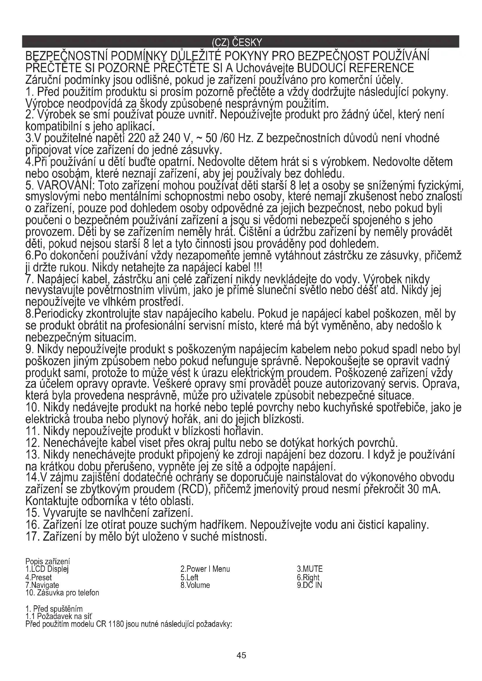 Popis zařízení 1.LCD Displej 2.Power I Menu 3.MUTE 4.Preset 5.Left 6.Right 7.Navigate 8.Volume 9.DC IN