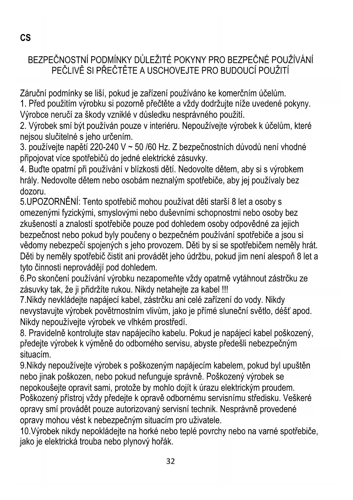 hrály. Nedovolte dětem nebo osobám neznalým spotřebiče, aby jej používaly bez dozoru. 5.UPOZORNĚNÍ: Tento spotřebič mohou používat děti starší 8 let a osoby s omezenými fyzickými, smyslovými nebo duševními schopnostmi nebo osoby bez zkušeností a znalostí spotřebiče pouze pod dohledem osoby odpovědné za jejich bezpečnost nebo pokud byly poučeny o bezpečném používání spotřebiče a jsou si vědomy nebezpečí spojených s jeho provozem. Děti by si se spotřebičem neměly hrát. Děti by neměly spotřebič čistit ani provádět jeho údržbu, pokud jim není alespoň 8 let a tyto činnosti neprovádějí pod dohledem. 6.Po skončení používání výrobku nezapomeňte vždy opatrně vytáhnout zástrčku ze zásuvky tak, že ji přidržíte rukou. Nikdy netahejte za kabel !!! 7.Nikdy nevkládejte napájecí kabel, zástrčku ani celé zařízení do vody. Nikdy nevystavujte výrobek povětrnostním vlivům, jako je přímé sluneční světlo, déšť apod. Nikdy nepoužívejte výrobek ve vlhkém prostředí.