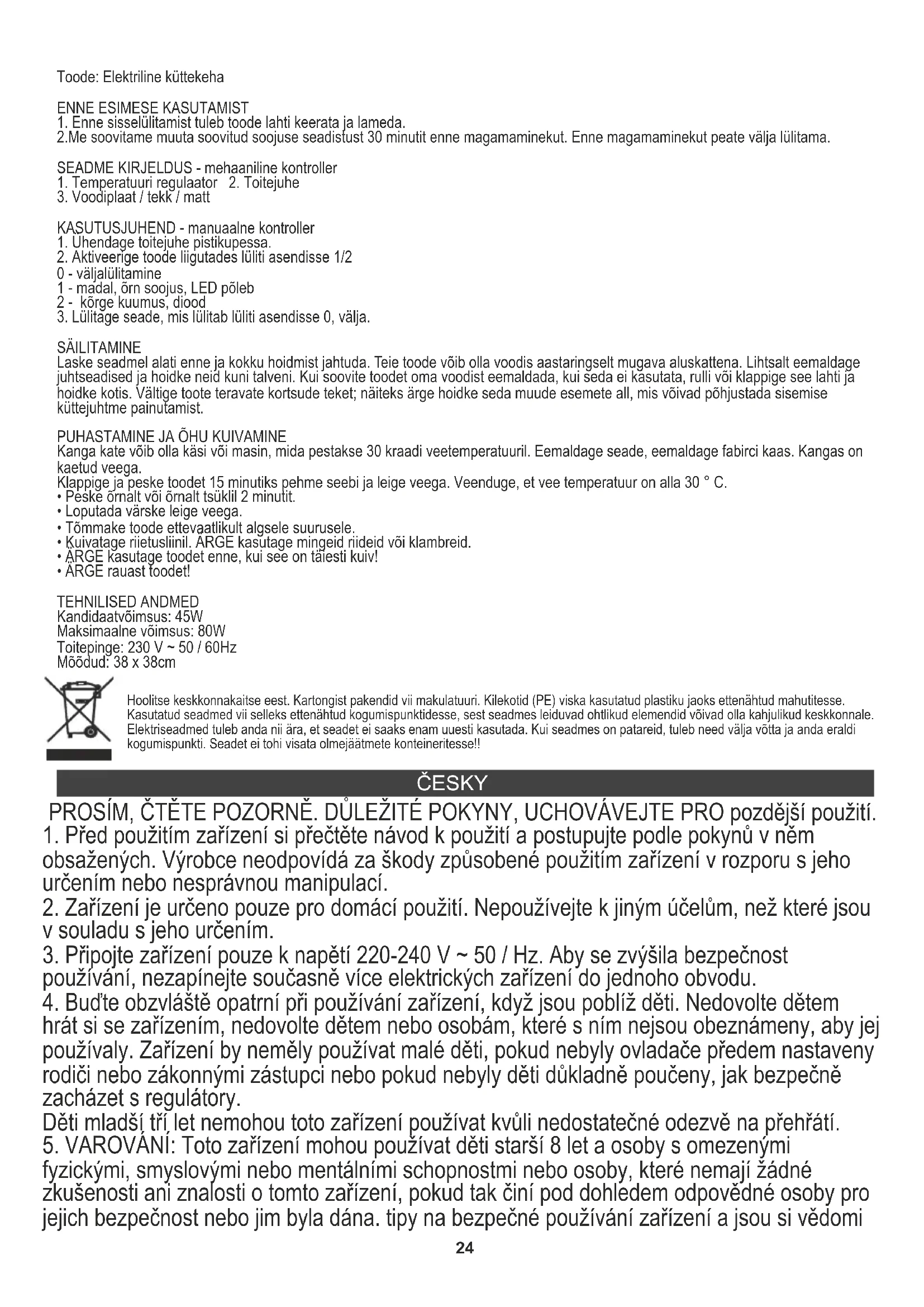 fyzickými, smyslovými nebo mentálními schopnostmi nebo osoby, které nemají žádné zkušenosti ani znalosti o tomto zařízení, pokud tak činí pod dohledem odpovědné osoby pro jejich bezpečnost nebo jim byla dána. tipy na bezpečné používání zařízení a jsou si vědomi25 nebezpečí spojených s jeho používáním. Děti by si s tímto zařízením neměly hrát. Čištění a údržbu zařízení by neměly provádět děti, pokud nejsou starší 8 let a nejsou pod dohledem. Toto zařízení nemohou používat lidé, kteří nejsou citliví na teplo, a lidé, kteří jsou velmi citliví na teplo, kteří nejsou schopni reagovat na přehřátí, a lidé, kteří vyžadují neustálou péči.