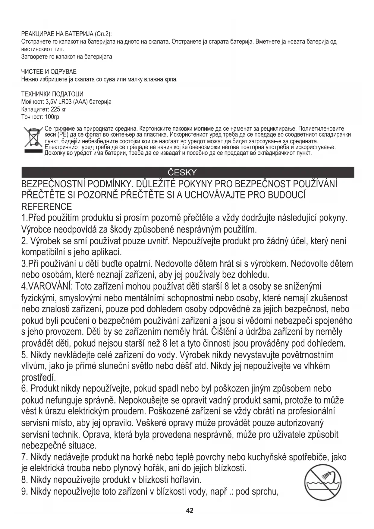 3.Při používání u dětí buďte opatrní. Nedovolte dětem hrát si s výrobkem. Nedovolte dětem nebo osobám, které neznají zařízení, aby jej používaly bez dohledu. Се грижиме за природната средина. Картонските паковки молиме да се наменат за рециклирање. Полиетиленовите кеси (PE) да се фрлат во контењер за пластика. Искористениот уред треба да се предаде во соодветниот складирачки пункт, бидејќи небезбедните состојки кои се наоѓаат во уредот можат да бидат загрозување за средината. Електричниот уред треба да се предаде на начин кој ќе оневозможи негова повторна употреба и искористување. Доколку во уредот има батерии, треба да се извадат и посебно да се предадат во складирачкиот пункт. Затворете го капакот на батеријата. ЧИСТЕЕ И ОДРУВАЕ Отстранете го капакот на батеријата на дното на скалата. Отстранете ја старата батерија. Вметнете ја новата батерија од вистинскиот тип. РЕАКЦИРАЕ НА БАТЕРИЈА (Сл.2): Нежно избришете ја скалата со сува или малку влажна крпа. Точност: 100гр ТЕХНИЧКИ ПОДАТОЦИ Моќност: 3,5V LR03 (AAA) батерија Капацитет: 225 кг ČESKY43