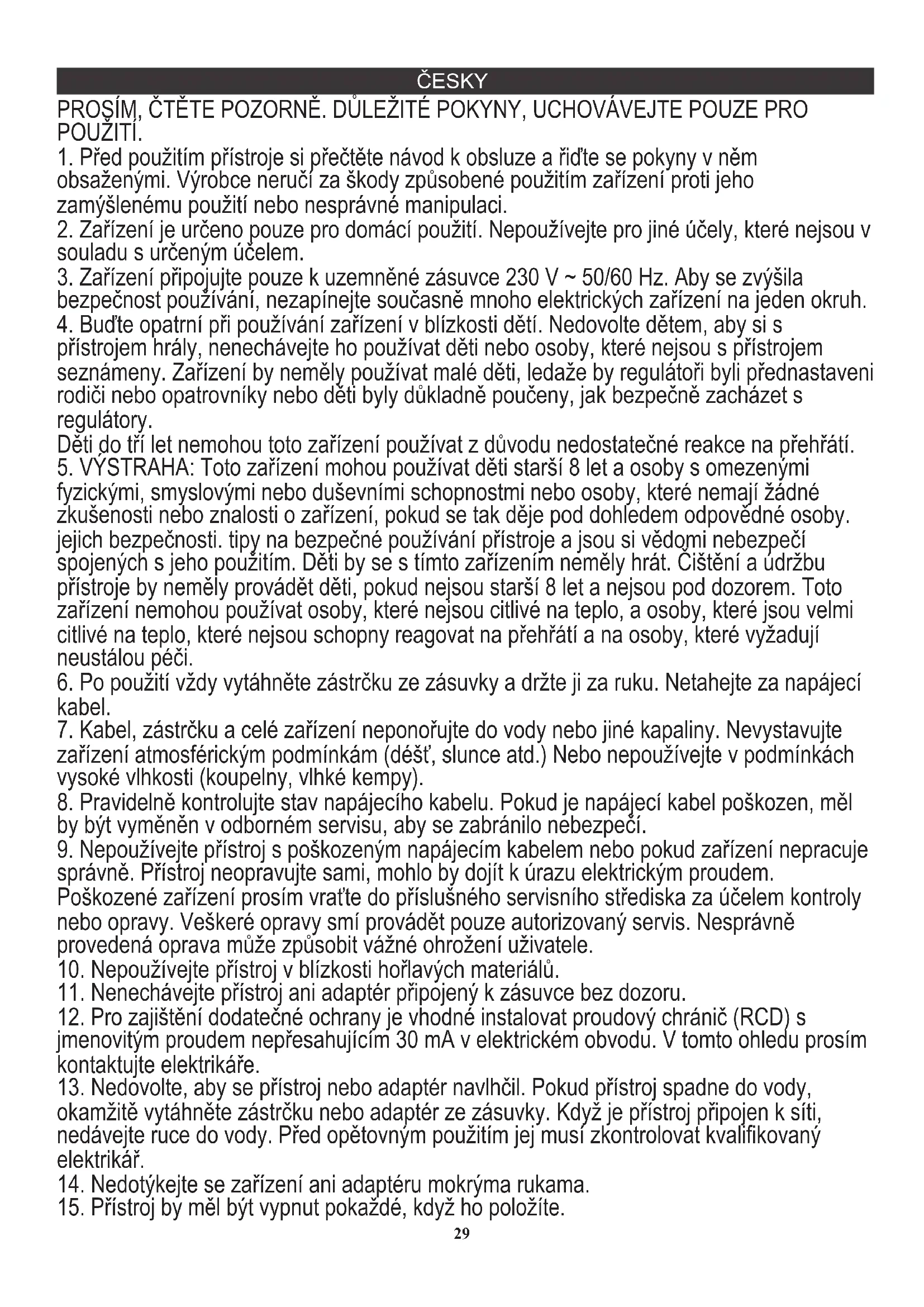 fyzickými, smyslovými nebo duševními schopnostmi nebo osoby, které nemají žádné zkušenosti nebo znalosti o zařízení, pokud se tak děje pod dohledem odpovědné osoby. jejich bezpečnosti. tipy na bezpečné používání přístroje a jsou si vědomi nebezpečí spojených s jeho použitím. Děti by se s tímto zařízením neměly hrát. Čištění a údržbu přístroje by neměly provádět děti, pokud nejsou starší 8 let a nejsou pod dozorem. Toto zařízení nemohou používat osoby, které nejsou citlivé na teplo, a osoby, které jsou velmi citlivé na teplo, které nejsou schopny reagovat na přehřátí a na osoby, které vyžadují neustálou péči.