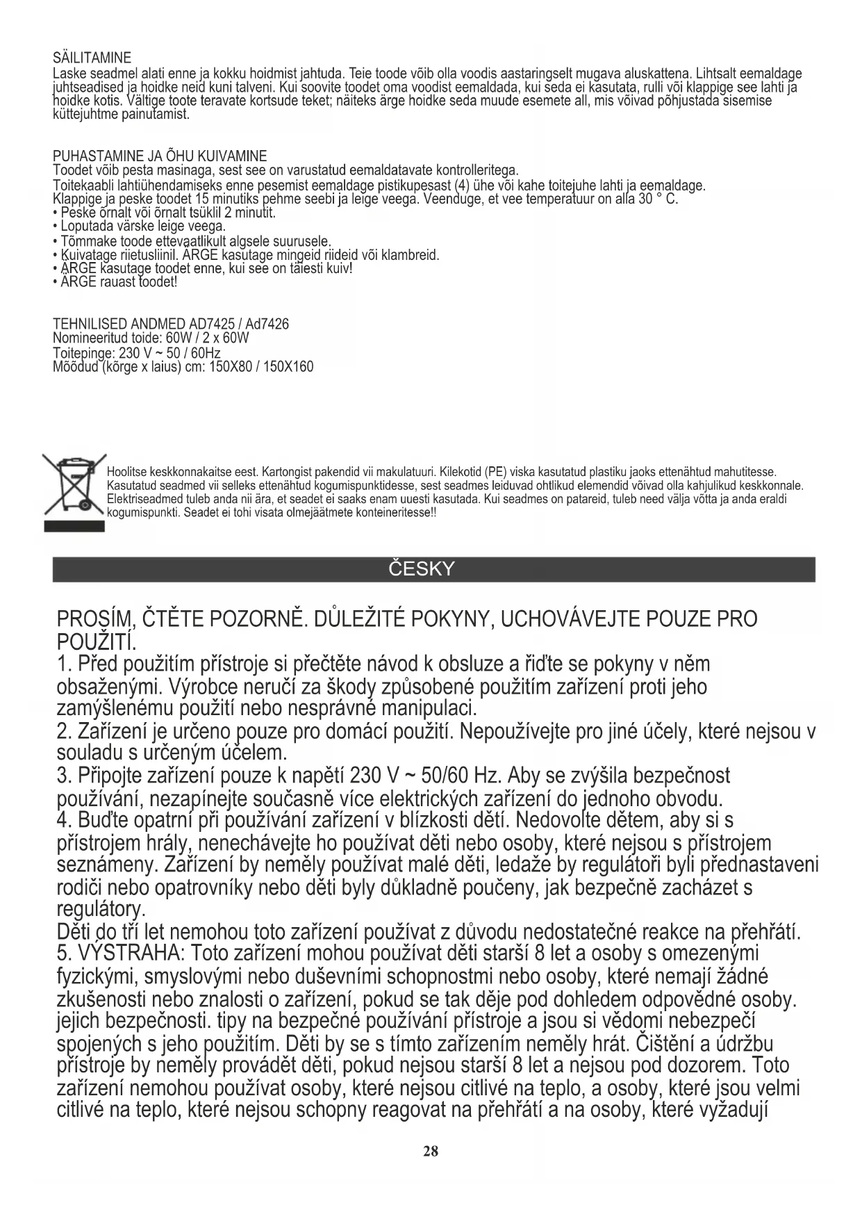 TECHNICKÉ ÚDAJE AD7425 / Ad7426 Jmenovitý příkon: 60W / 2 x 60W Napájecí napětí: 230 V ~ 50 / 60Hz Rozměry (vysoká šířka x) cm: 150X80 / 150X160 30ROMÂNĂ VĂ RUGĂM CITIȚI CU ATENȚIE. INSTRUCȚIUNI IMPORTANTE, PĂSTRAȚI PENTRU UTILIZARI ULTERIOARE.