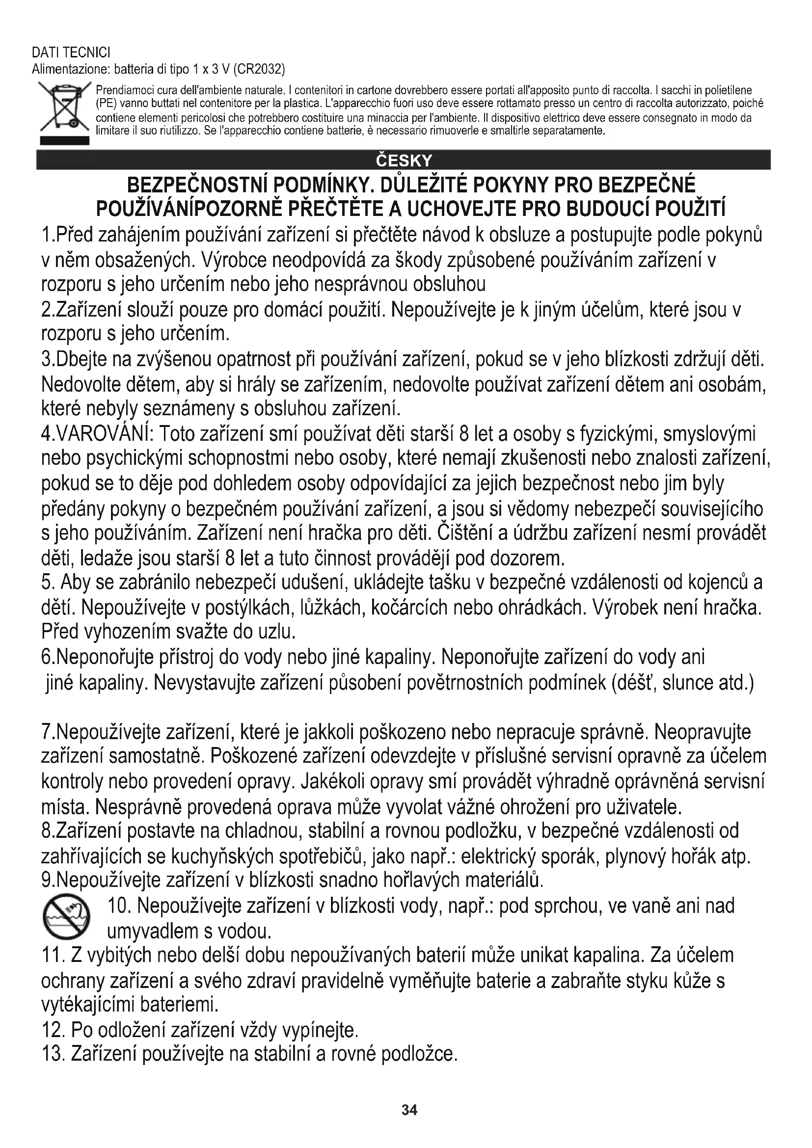 - Pulire la bilancia pesapersone con un panno asciutto o leggermente bagnato. MESSAGGI a – batteria scarica b – troppo carico sulla bilancia pesapersone34 DATI TECNICI Alimentazione: batteria di tipo 1 x 3 V (CR2032) ČESKY BEZPEČNOSTNÍ PODMÍNKY. DŮLEŽITÉ POKYNY PRO BEZPEČNÉ POUŽÍVÁNÍPOZORNĚ PŘEČTĚTE A UCHOVEJTE PRO BUDOUCÍ POUŽITÍ 1.Před zahájením používání zařízení si přečtěte návod k obsluze a postupujte podle pokynů v něm obsažených. Výrobce neodpovídá za škody způsobené používáním zařízení v rozporu s jeho určením nebo jeho nesprávnou obsluhou 2.Zařízení slouží pouze pro domácí použití. Nepoužívejte je k jiným účelům, které jsou v rozporu s jeho určením. 3.Dbejte na zvýšenou opatrnost při používání zařízení, pokud se v jeho blízkosti zdržují děti. Nedovolte dětem, aby si hrály se zařízením, nedovolte používat zařízení dětem ani osobám, které nebyly seznámeny s obsluhou zařízení. 4.VAROVÁNÍ: Toto zařízení smí používat děti starší 8 let a osoby s fyzickými, smyslovými nebo psychickými schopnostmi nebo osoby, které nemají zkušenosti nebo znalosti zařízení, pokud se to děje pod dohledem osoby odpovídající za jejich bezpečnost nebo jim byly předány pokyny o bezpečném používání zařízení, a jsou si vědomy nebezpečí souvisejícího s jeho používáním. Zařízení není hračka pro děti. Čištění a údržbu zařízení nesmí provádět děti, ledaže jsou starší 8 let a tuto činnost provádějí pod dozorem.