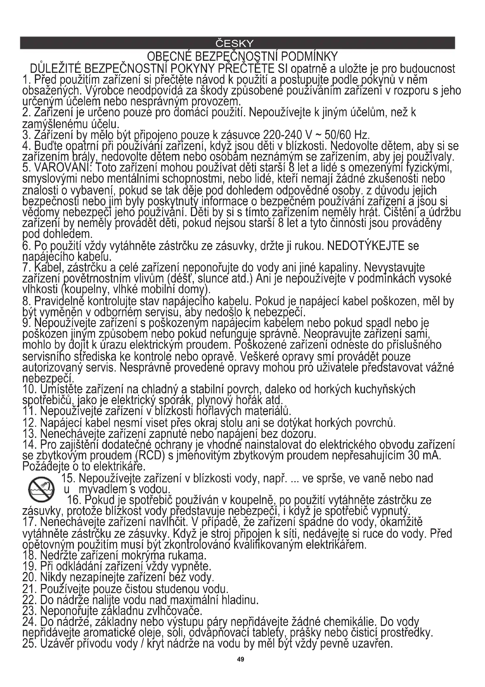 15. Nepoužívejte zařízení v blízkosti vody, např. ... ve sprše, ve vaně nebo nad