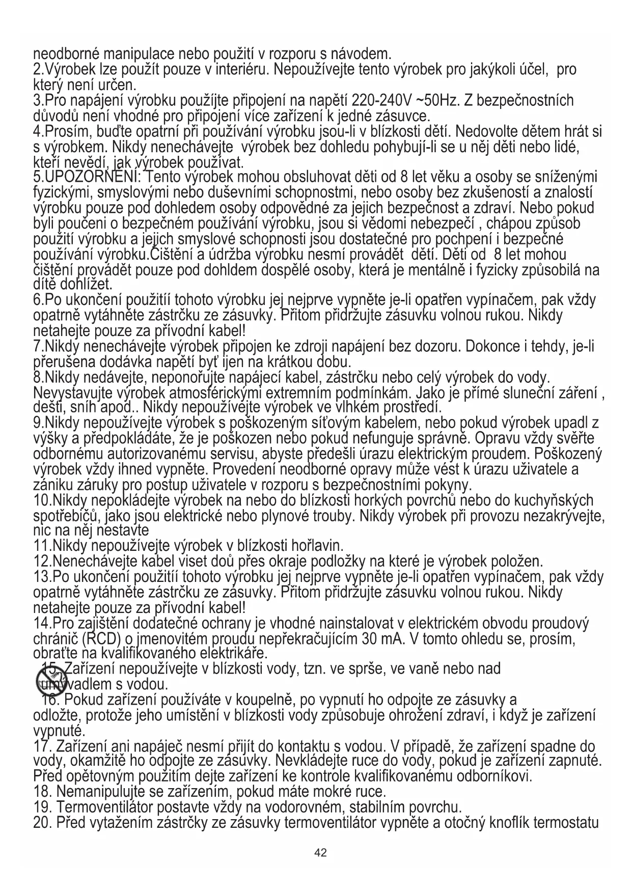 21. Termoventilátor nepužívejte v místnostech s vysokou vlhkostí vzduchu – koupelny,