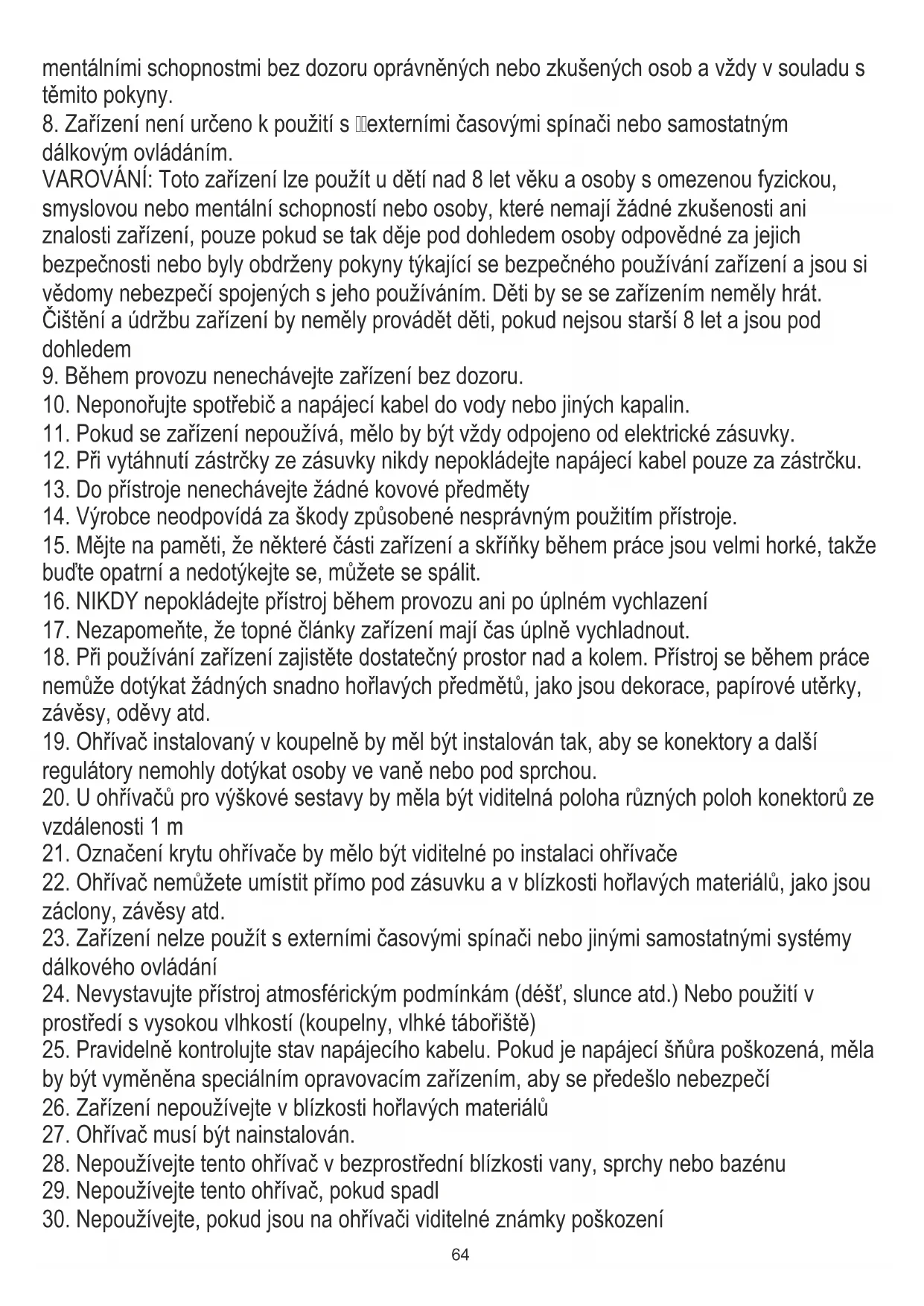 31. Ohřívač používejte na rovném a stabilním povrchu nebo jej připevněte ke stěně, pokud to