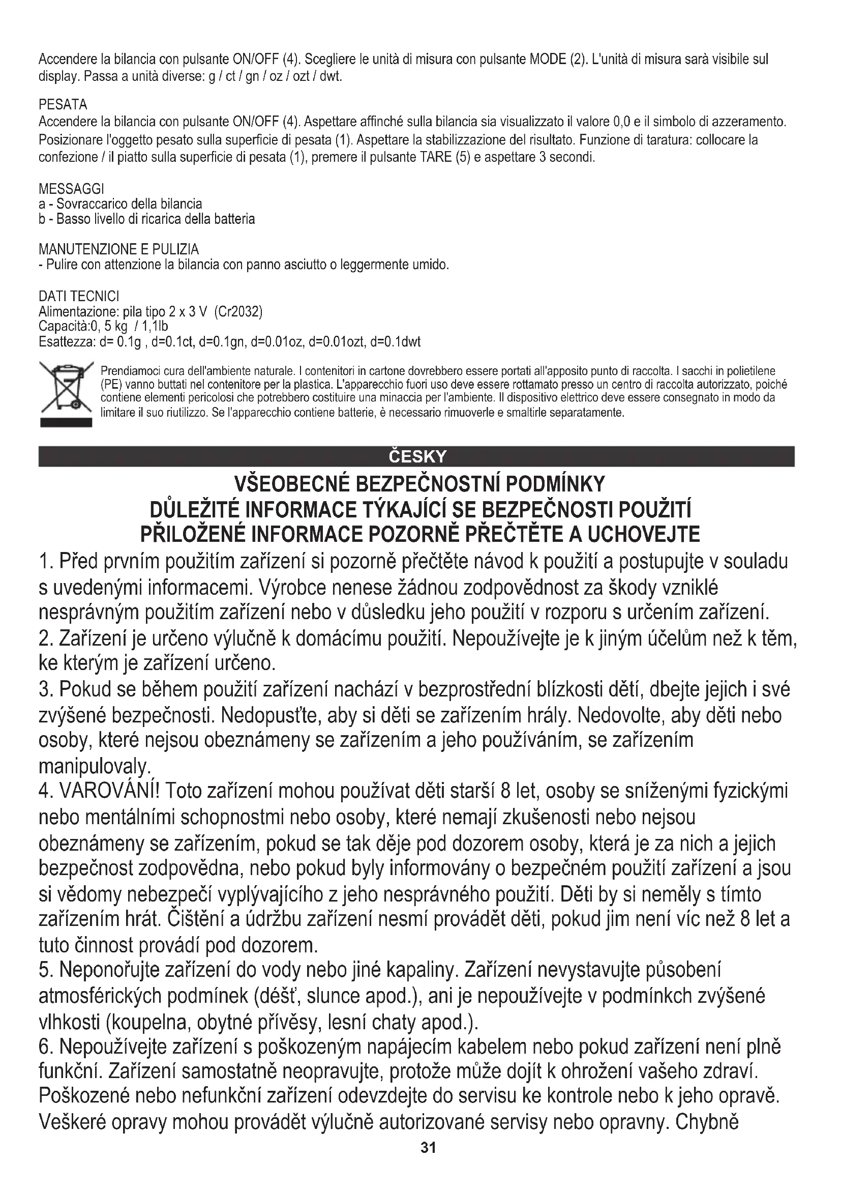Napájení: baterie typu 2 x 3 V (Cr2032) HLÁŠENÍ Přesnost: d= 0.1g , d=0.1ct, d=0.1gn, d=0.01oz, d=0.01ozt, d=0.1dwt b – Nízká hladina nabití baterie Váhu pomocí tlačítka ON/OFF (4) zapněte. Počkejte, až váha ukáže hodnotu 0,0 a symbol nulování. Vážený předmět položte na vážicí plochu (1). Chvíli vyčkejte, dokud se výsledek nestabilizuje. Funkce tárování: samo balení/nádobu položte na vážicí plochu, stiskněte tlačitko TARA (5) a vyčkejte 3 sekundy. Ochrana životního prostředí. Kartón odevzdejte do sběru. Polyetylénové sáčky (PE) vyhazujte do kontejneru na plasty. Vysloužilý přístroj odevzdejte do příslušného sběrného dvoru, protože některé části zařízení mohou představovat pro životní prostředí nebezpečí. Elektrický přístroj odevzdejte tak, aby se omezilo jeho opětovné používání. Pokud jsou v přístroji baterie, vyjměte je a odevzdejte do příslušného sběrného místa zvlášť. Přístroj nevyhazujte do popelnic ani kontejneru na směsný odpad!! EESTI OHUTUSTINGIMUSED LOE TÄHELEPANELIKULT LÄBI JA HOIA ALLES HILISEMAKS KASUTAMISEKS