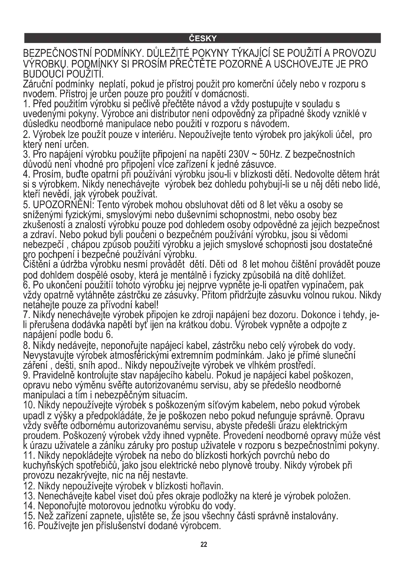 důvodů není vhodné pro připojení více zařízení k jedné zásuvce. Záruční podmínky neplatí, pokud je přístroj použit pro komerční účely nebo v rozporu s nvodem. Přístroj je určen pouze pro použití v domácnosti.