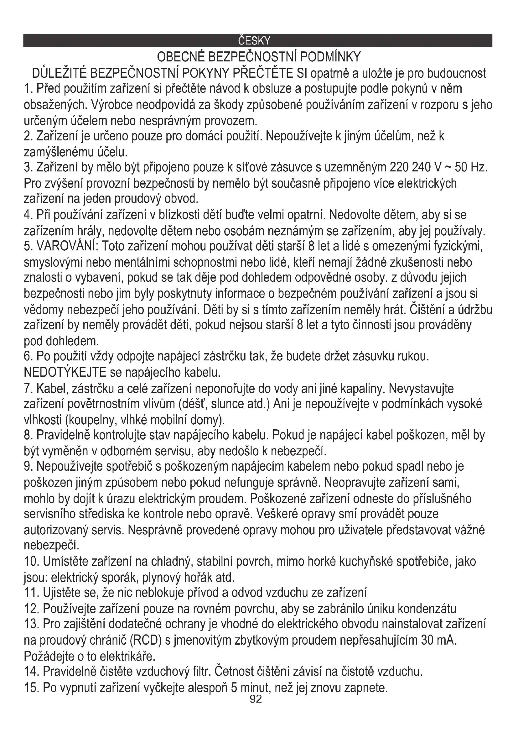 smyslovými nebo mentálními schopnostmi nebo lidé, kteří nemají žádné zkušenosti nebo znalosti o vybavení, pokud se tak děje pod dohledem odpovědné osoby. z důvodu jejich bezpečnosti nebo jim byly poskytnuty informace o bezpečném používání zařízení a jsou si vědomy nebezpečí jeho používání. Děti by si s tímto zařízením neměly hrát. Čištění a údržbu zařízení by neměly provádět děti, pokud nejsou starší 8 let a tyto činnosti jsou prováděny pod dohledem.