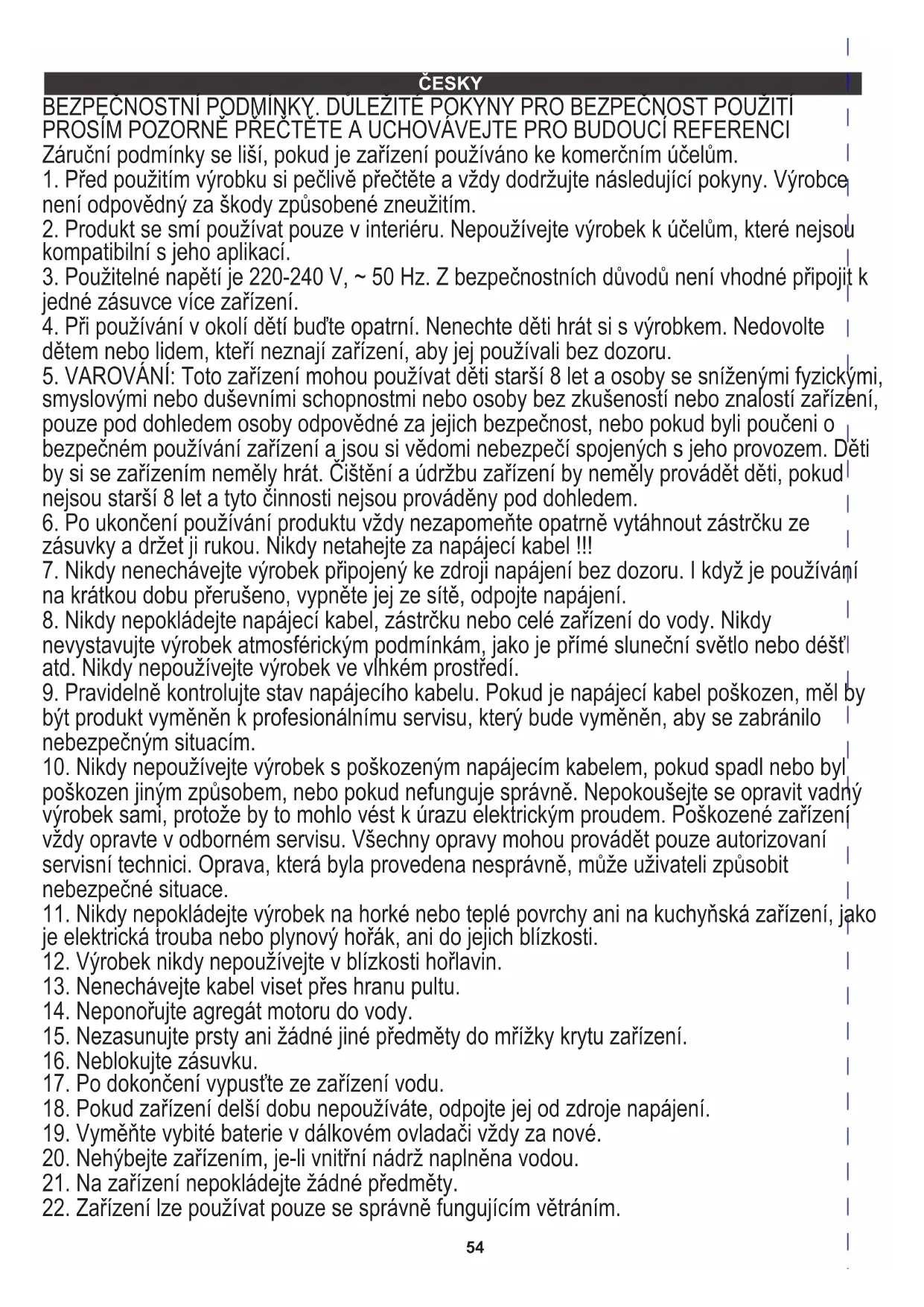 není odpovědný za škody způsobené zneužitím. PROSÍM POZORNĚ PŘEČTĚTE A UCHOVÁVEJTE PRO BUDOUCÍ REFERENCI Záruční podmínky se liší, pokud je zařízení používáno ke komerčním účelům. BEZPEČNOSTNÍ PODMÍNKY. DŮLEŽITÉ POKYNY PRO BEZPEČNOST POUŽITÍ ČESKY55