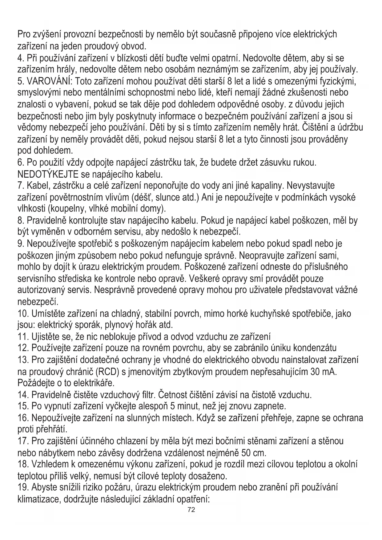 nebo nábytkem nebo závěsy dodržena vzdálenost nejméně 50 cm. 72e) Před údržbou odpojte klimatizaci.
