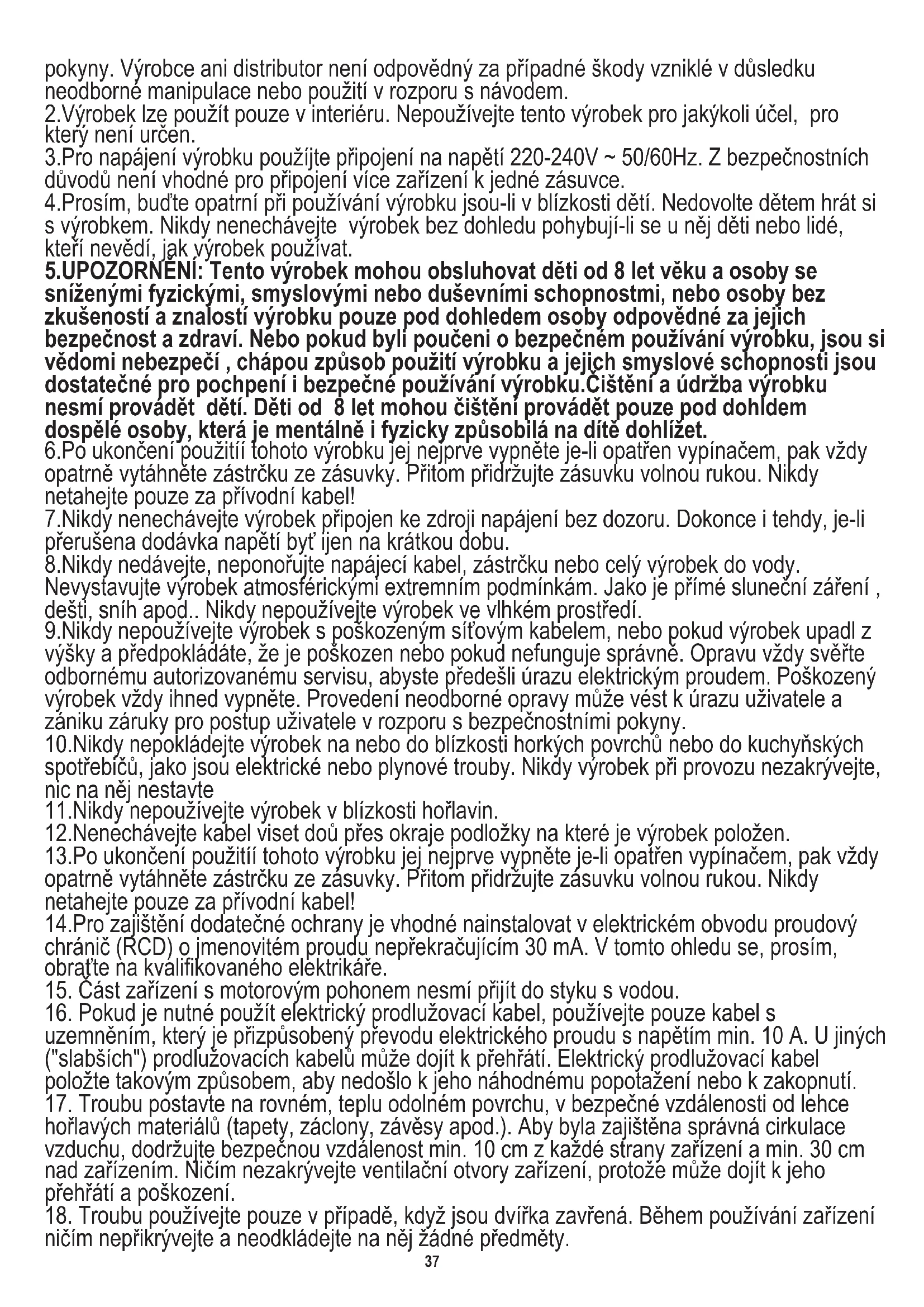 uzemněním, který je přizpůsobený převodu elektrického proudu s napětím min. 10 A. U jiných ("slabších") prodlužovacích kabelů může dojít k přehřátí. Elektrický prodlužovací kabel položte takovým způsobem, aby nedošlo k jeho náhodnému popotažení nebo k zakopnutí. 4.Prosím, buďte opatrní při používání výrobku jsou-li v blízkosti dětí. Nedovolte dětem hrát si s výrobkem. Nikdy nenechávejte výrobek bez dohledu pohybují-li se u něj děti nebo lidé, kteří nevědí, jak výrobek používat. 14.Pro zajištění dodatečné ochrany je vhodné nainstalovat v elektrickém obvodu proudový chránič (RCD) o jmenovitém proudu nepřekračujícím 30 mA. V tomto ohledu se, prosím, obraťte na kvalifikovaného elektrikáře. 3.Pro napájení výrobku použíjte připojení na napětí 220-240V ~ 50/60Hz. Z bezpečnostních důvodů není vhodné pro připojení více zařízení k jedné zásuvce.