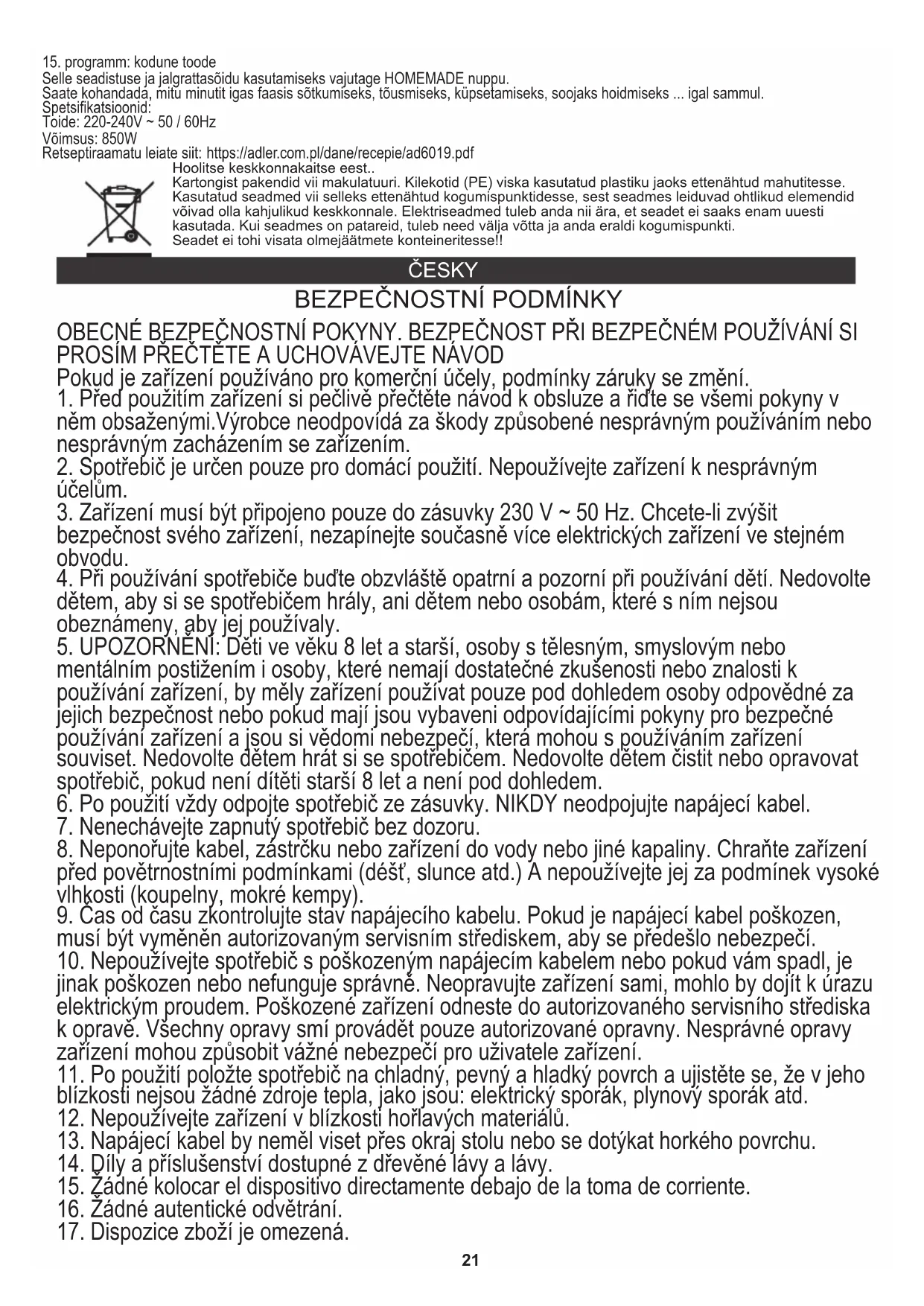 Program 10: Těsto Hnětení a zvedání, ale bez pečení. Vyjměte těsto a použijte k výrobě pekáren, pizzy, vařeného chleba atd. Program 11: Cestovní těsto Pro přípravu mouky a vody nebo některých dalších se může dobře mísit. Program 12: Jogurtové kvasnice a udělejte jogurt. Program 13: Uvíznutí uvíznutí a marmelády. Program 14: Pečení Pro přídavné pečení chleba, který je příliš světlý nebo nepečený. V tomto programu nedochází k hnětení ani zvedání. Program 15: Domácí Stisknutím tlačítka HOMEMADE použijte toto nastavení.. Můžete si přizpůsobit, kolik minut v každé fázi hnětení, vzestupu, pečení, udržujte v teple ... každý krok. Specifikace: Napájení: 220-240V ~ 50 / 60Hz Výkon: 850 W Knihu receptů najdete zde: https://adler.com.pl/dane/recepie/ad6019.pdf Ochrana životního prostředí. Kartón odevzdejte do sběru. Polyetylénové sáčky (PE) vyhazujte do kontejneru na plasty. Vysloužilý přístroj odevzdejte do příslušného sběrného dvoru, protože některé části zařízení mohou představovat pro životní prostředí nebezpečí. Elektrický přístroj odevzdejte tak, aby se omezilo jeho opětovné používání. Pokud jsou v přístroji baterie, vyjměte je a odevzdejte do příslušného sběrného místa zvlášť. Přístroj nevyhazujte do popelnic ani kontejneru na směsný odpad!! SLOVENČINA
