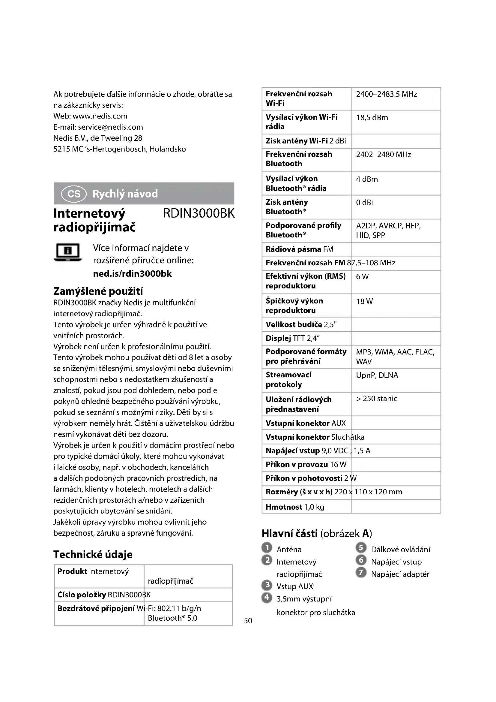 Rychlý návod Internetový radiopřijímač RDIN3000BK Více informací najdete v rozšířené příručce online: ned.is/rdin3000bk Zamýšlené použití RDIN3000BK značky Nedis je multifunkční internetový radiopřijímač. Tento výrobek je určen výhradně k použití ve vnitřních prostorách. Výrobek není určen k profesionálnímu použití. Tento výrobek mohou používat děti od 8 let a osoby se sníženými tělesnými, smyslovými nebo duševními schopnostmi nebo s nedostatkem zkušeností a znalostí, pokud jsou pod dohledem, nebo podle pokynů ohledně bezpečného používání výrobku, pokud se seznámí s možnými riziky. Děti by si s výrobkem neměly hrát. Čištění a uživatelskou údržbu nesmí vykonávat děti bez dozoru. Výrobek je určen k použití v domácím prostředí nebo pro typické domácí úkoly, které mohou vykonávat i laické osoby, např. v obchodech, kancelářích a dalších podobných pracovních prostředích, na farmách, klienty v hotelech, motelech a dalších rezidenčních prostorách a/nebo v zařízeních poskytujících ubytování se snídání. Jakékoli úpravy výrobku mohou ovlivnit jeho bezpečnost, záruku a správné fungování. Technické údaje Produkt Internetový radiopřijímač Číslo položky RDIN3000BK Bezdrátové připojení Wi-Fi: 802.11 b/g/n Bluetooth® 5.051