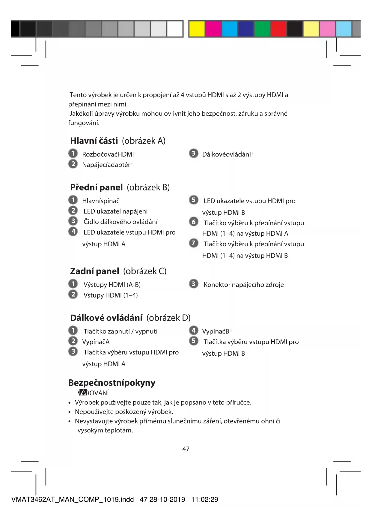 Tlačítka výběru vstupu HDMI pro výstup HDMI B Bezpečnostní pokyny