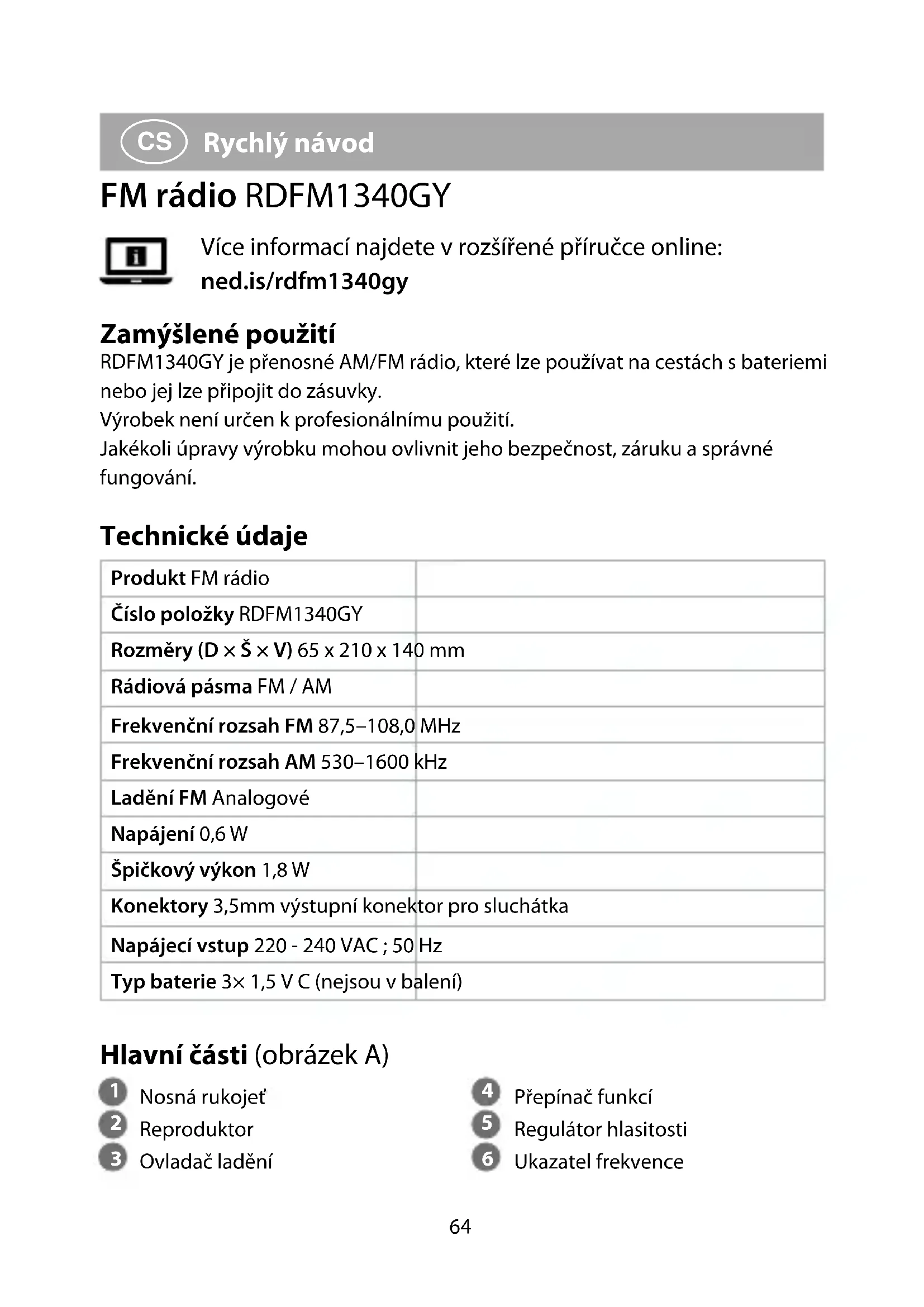 Rychlý návod FM rádio RDFM1340GY Více informací najdete v rozšířené příručce online: ned.is/rdfm1340gy Zamýšlené použití RDFM1340GY je přenosné AM/FM rádio, které lze používat na cestách sbateriemi nebo jej lze připojit do zásuvky. Výrobek není určen k profesionálnímu použití. Jakékoli úpravy výrobku mohou ovlivnit jeho bezpečnost, záruku a správné fungování. Technické údaje Produkt FM rádio Číslo položky RDFM1340GY Rozměry (D × Š × V) 65 x 210 x 140 mm Rádiová pásma FM / AM Frekvenční rozsah FM 87,5–108,0MHz Frekvenční rozsah AM 530–1600kHz Ladění FM Analogové Napájení 0,6 W Špičkový výkon 1,8 W Konektory 3,5mm výstupní konektor pro sluchátka Napájecí vstup 220 - 240 VAC ; 50 Hz Typ baterie 3× 1,5 V C (nejsou v balení) Hlavní části (obrázek A)