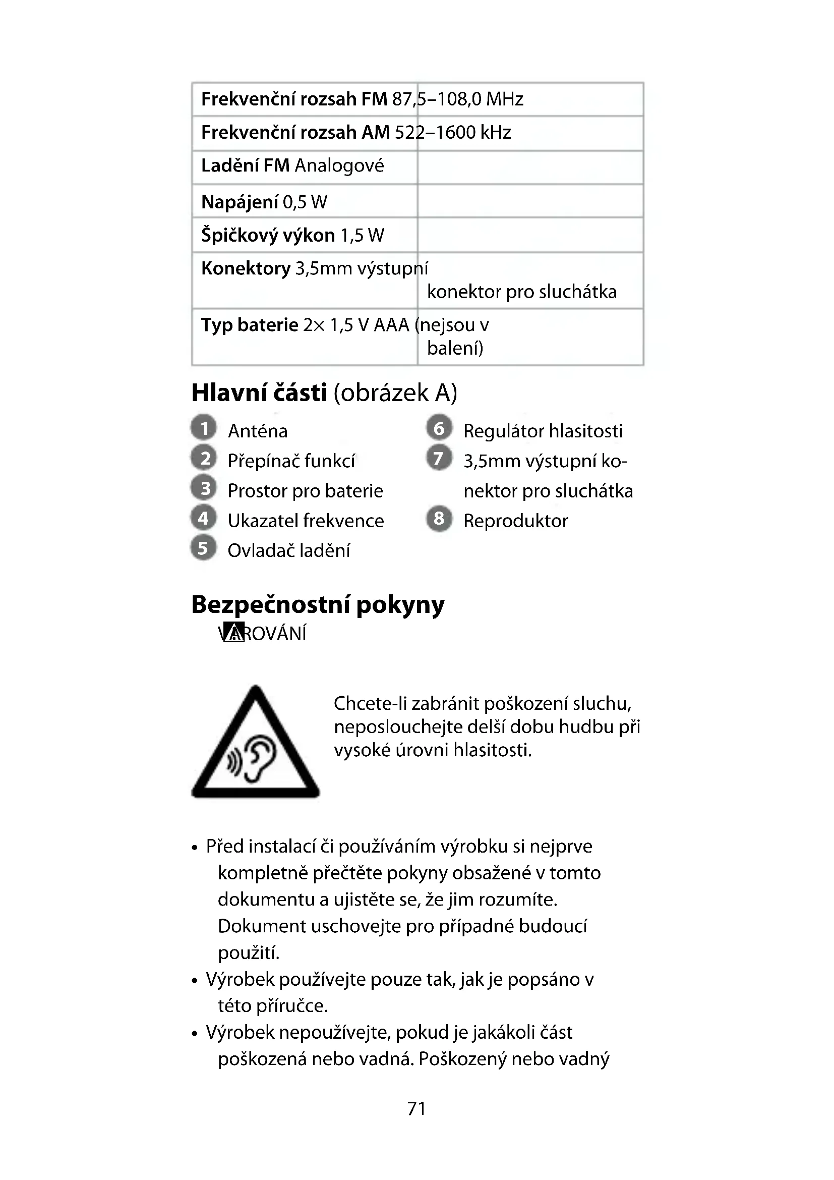 VAROVÁNÍ Chcete-li zabránit poškození sluchu, neposlouchejte delší dobu hudbu při vysoké úrovni hlasitosti.