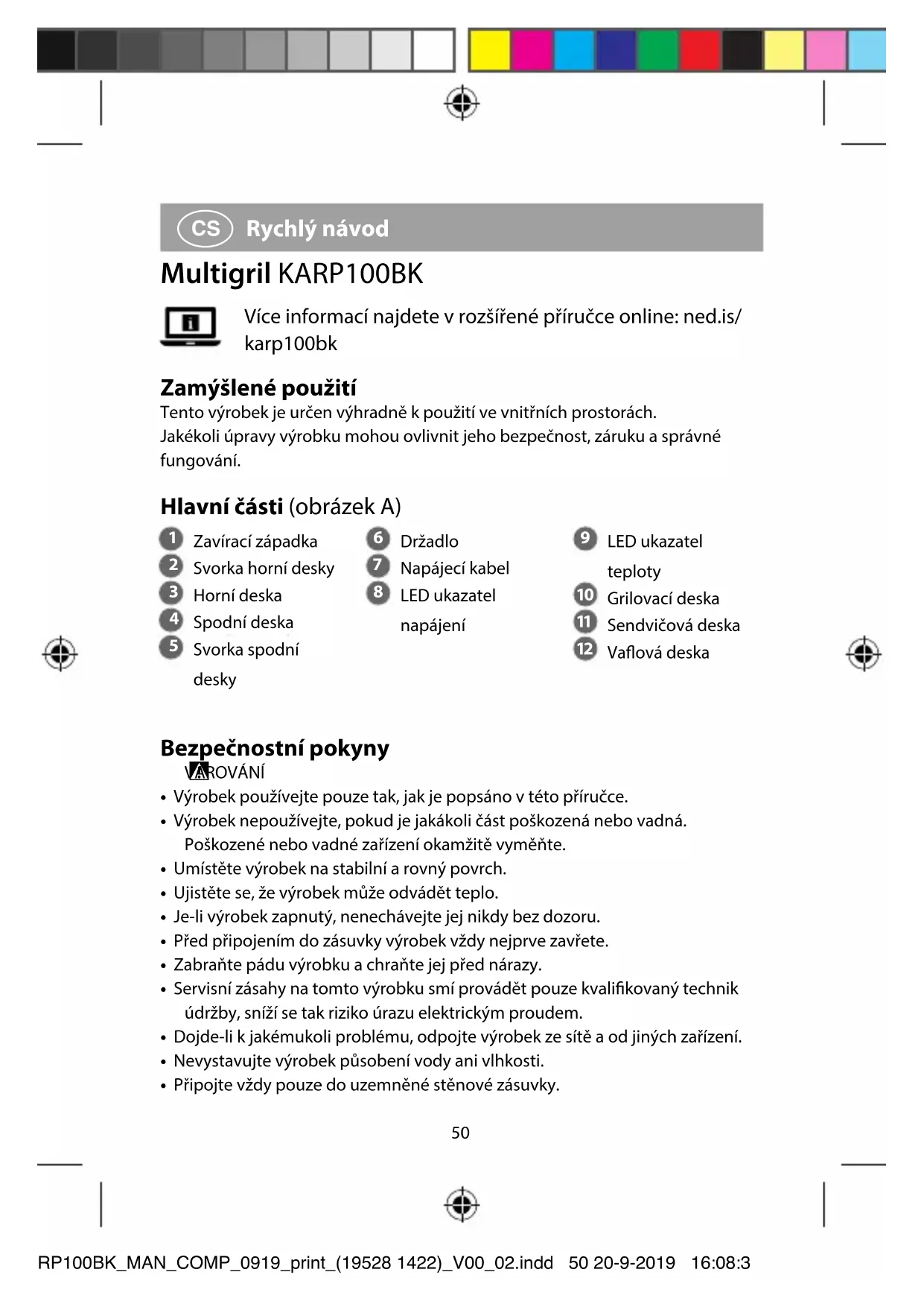 VAROVÁNÍ• Výrobek používejte pouze tak, jak je popsáno v této příručce.• Výrobek nepoužívejte, pokud je jakákoli část poškozená nebo vadná. Poškozené nebo vadné zařízení okamžitě vyměňte.• Umístěte výrobek na stabilní a rovný povrch.• Ujistěte se, že výrobek může odvádět teplo.• Je-li výrobek zapnutý, nenechávejte jej nikdy bez dozoru.• Před připojením do zásuvky výrobek vždy nejprve zavřete.• Zabraňte pádu výrobku a chraňte jej před nárazy.• Servisní zásahy na tomto výrobku smí provádět pouze kvalikovaný technik údržby, sníží se tak riziko úrazu elektrickým proudem.• Dojde-li k jakémukoli problému, odpojte výrobek ze sítě a od jiných zařízení.• Nevystavujte výrobek působení vody ani vlhkosti.• Připojte vždy pouze do uzemněné stěnové zásuvky.KARP100BK_MAN_COMP_0919_print_(19528 1422)_V00_02.indd 50 20-9-2019 16:08:3851