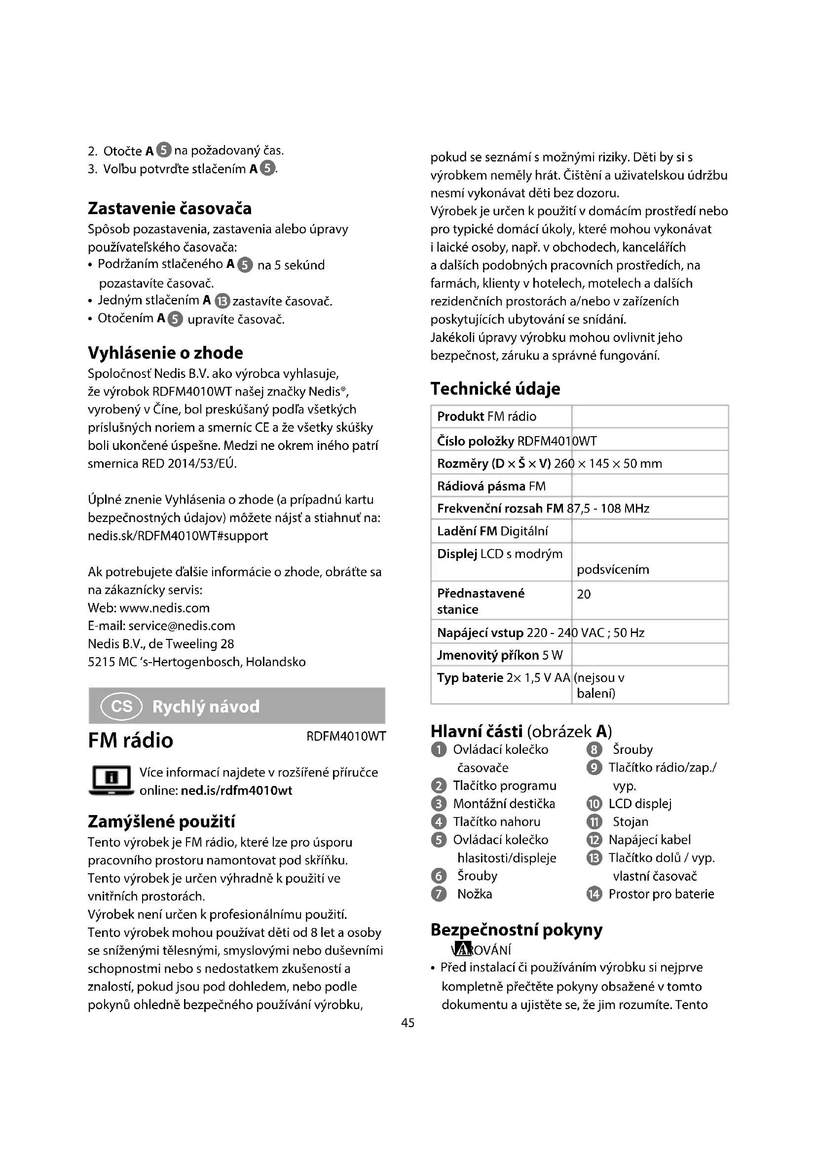 vypnete pohotovostný režim.45 pokud se seznámí s možnými riziky. Děti by si s výrobkem neměly hrát. Čištění a uživatelskou údržbu nesmí vykonávat děti bez dozoru.Výrobek je určen kpoužití vdomácím prostředí nebo pro typické domácí úkoly, které mohou vykonávat i laické osoby, např. vobchodech, kancelářích adalších podobných pracovních prostředích, na farmách, klienty vhotelech, motelech adalších rezidenčních prostorách a/nebo vzařízeních poskytujících ubytování se snídání.Jakékoli úpravy výrobku mohou ovlivnit jeho bezpečnost, záruku a správné fungování. Technické údaje Produkt FM rádioČíslo položky RDFM4010WTRozměry (D × Š × V) 260 × 145 × 50mmRádiová pásma FMFrekvenční rozsah FM 87,5 - 108 MHzLadění FM DigitálníDisplej LCD smodrým podsvícenímPřednastavené stanice Napájecí vstup 220 - 240 VAC ; 50 HzJmenovitý příkon 5 WTyp baterie 2× 1,5 V AA (nejsou v balení) Hlavní části (obrázek A) 1 Ovládací kolečko časovače 2 Tlačítko programu 3 Montážní destička 4 Tlačítko nahoru 5 Ovládací kolečko hlasitosti/displeje 6 Šrouby 7 Nožka 8 Šrouby 9 Tlačítko rádio/zap./ vyp. q LCD displej w Stojan e Napájecí kabel r Tlačítko dolů / vyp. vlastní časovač t Prostor pro baterie Bezpečnostní pokyny