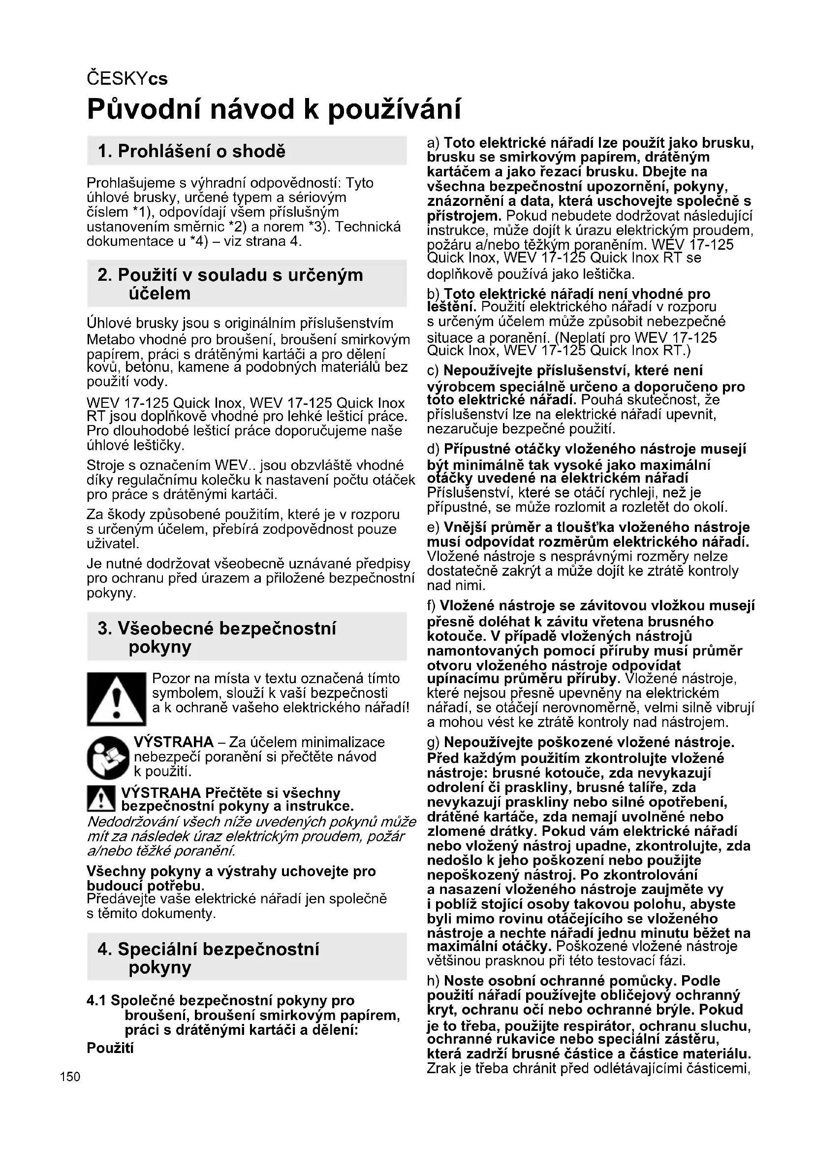 Původní návod k používání Prohlašujeme s výhradní odpovědností: Tyto úhlové brusky, určené typem a sériovým číslem *1), odpovídají všem příslušným ustanovením směrnic *2) a norem *3). Technická dokumentace u *4) – viz strana 4. Úhlové brusky jsou s originálním příslušenstvím Metabo vhodné pro broušení, broušení smirkovým papírem, práci s drátěnými kartáči a pro dělení kovů, betonu, kamene a podobných materiálů bez použití vody. WEV 17-125 Quick Inox, WEV 17-125 Quick Inox RT jsou doplňkově vhodné pro lehké lešticí práce. Pro dlouhodobé lešticí práce doporučujeme naše úhlové leštičky. Stroje s označením WEV.. jsou obzvláště vhodné díky regulačnímu kolečku k nastavení počtu otáček pro práce s drátěnými kartáči. Za škody způsobené použitím, které je v rozporu s určeným účelem, přebírá zodpovědnost pouze uživatel. Je nutné dodržovat všeobecně uznávané předpisy pro ochranu před úrazem a přiložené bezpečnostní pokyny. Pozor na místa v textu označená tímto symbolem, slouží k vaší bezpečnosti a k ochraně vašeho elektrického nářadí! VÝSTRAHA – Za účelem minimalizace nebezpečí poranění si přečtěte návod k použití. VÝSTRAHA Přečtěte si všechny bezpečnostní pokyny a instrukce. Nedodržování všech níže uvedených pokynů může mít za následek úraz elektrickým proudem, požár a/nebo těžké poranění. Všechny pokyny a výstrahy uchovejte pro budoucí potřebu. Předávejte vaše elektrické nářadí jen společně s těmito dokumenty.