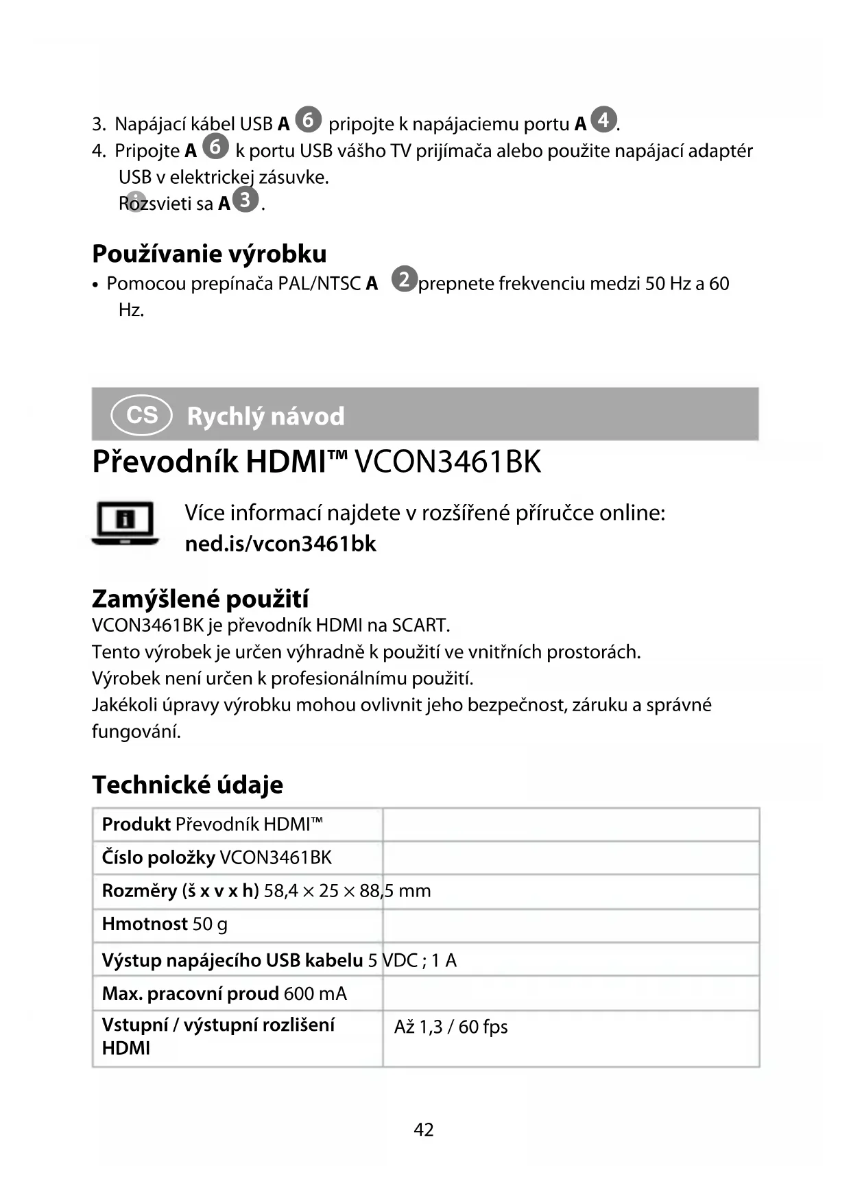 Rychlý návod Převodník HDMI™ VCON3461BK Více informací najdete v rozšířené příručce online: ned.is/vcon3461bk Zamýšlené použití VCON3461BK je převodník HDMI na SCART.Tento výrobek je určen výhradně k použití ve vnitřních prostorách.Výrobek není určen k profesionálnímu použití.Jakékoli úpravy výrobku mohou ovlivnit jeho bezpečnost, záruku a správné fungování. Technické údaje Produkt Převodník HDMI™Číslo položky VCON3461BKRozměry (š x v x h) 58,4 × 25 × 88,5mmHmotnost 50 gVýstup napájecího USB kabelu 5 VDC ; 1 AMax. pracovní proud 600 mAVstupní / výstupní rozlišení HDMI Až 1,3 / 60fps43 Podporovaný barevný formát videa HDMI 24bit / Deep Color 30bit / 36bit Max. šířka pásma HDMI 300MHz Max. přenosová rychlost HDMI 10,2 Gb/s Vstupní / výstupní signál TMDS 0,5–1,5Vp-p (TTL) Vstupní / výstupní signál DDC 5Vp-p (TTL) Analogový výstup RCA (1kHZ při 0dB) 1VRMS Odstup signál-šum při dB (CC1R / ARM) ≥ 90 dB Zkreslení ≤ 0,1 % Kmitočtová charakteristika 20 Hz ~ 20000 Hz Max. délka vstupního kabelu HDMI ≤7m AWG26 standardní kabel HDMI Max. délka výstupního kabelu SCART ≤8m AWG26 standardní kabel SCART Provozní teplota -10°C až 55°C Skladovací teplota -20°C až 60°C Provozní vlhkost 10–90%RH (bez kondenzace) Skladovací vlhkost 5–95%RH (bez kondenzace) Hlavní části (obrázek A)