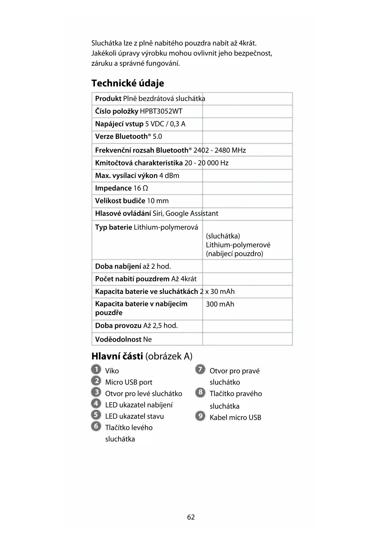 Rychlý návod Plně bezdrátová sluchátka HPBT3052WT Více informací najdete v rozšířené příručce online: ned.is/hpbt3052wt Zamýšlené použití HPBT3052WT značky Nedis jsou plně bezdrátová sluchátka. Tento výrobek lze spárovat slibovolným audio/video zařízením, které má funkci Bluetooth.62 Sluchátka lze z plně nabitého pouzdra nabít až 4krát. Jakékoli úpravy výrobku mohou ovlivnit jeho bezpečnost, záruku a správné fungování. Technické údaje Produkt Plně bezdrátová sluchátka Číslo položky HPBT3052WT Napájecí vstup 5 VDC / 0,3 A Verze Bluetooth® 5.0 Frekvenční rozsah Bluetooth® 2402 - 2480 MHz Kmitočtová charakteristika 20 - 20000 Hz Max. vysílací výkon 4 dBm Impedance 16 Ω Velikost budiče 10mm Hlasové ovládání Siri, Google Assistant Typ baterie Lithium-polymerová (sluchátka) Lithium-polymerové (nabíjecí pouzdro) Doba nabíjení až 2 hod. Počet nabití pouzdrem Až 4krát Kapacita baterie ve sluchátkách 2 x 30 mAh Kapacita baterie vnabíjecím pouzdře 300 mAh Doba provozu Až 2,5 hod. Voděodolnost Ne Hlavní části (obrázek A)