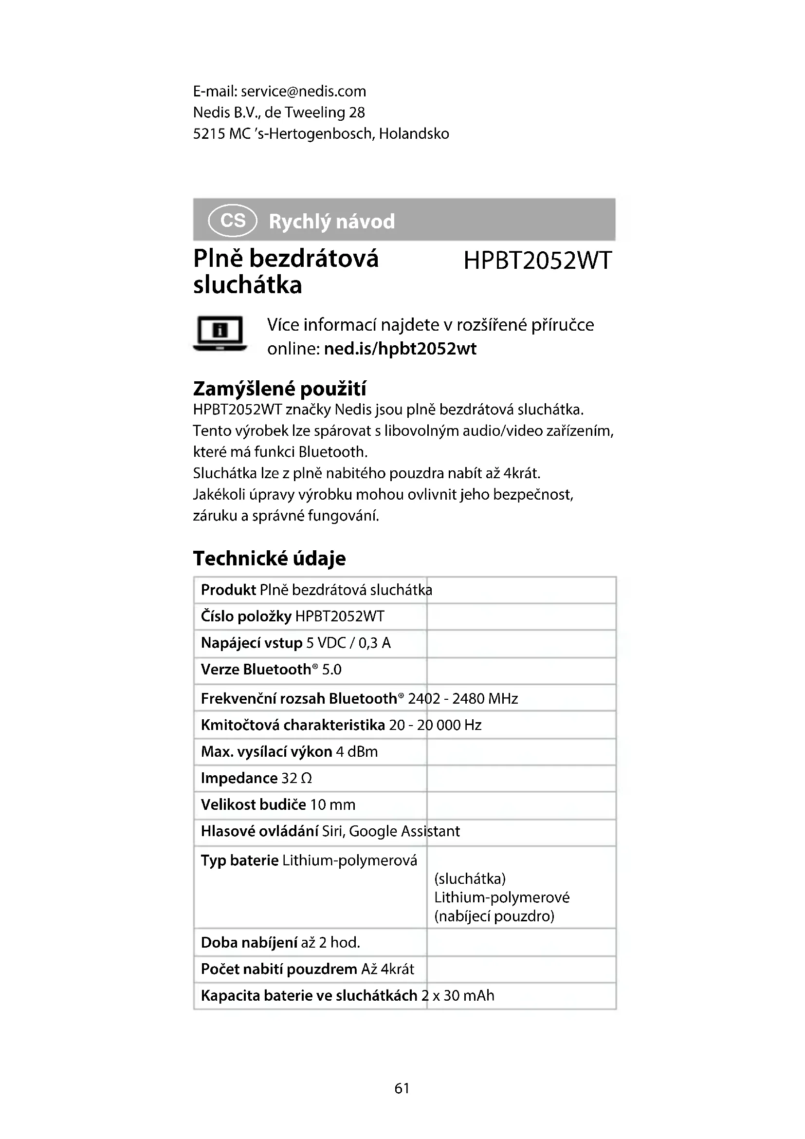 Najděte návod k zařízení zdarma HPBT2052WT NEDIS ve formátu PDF.