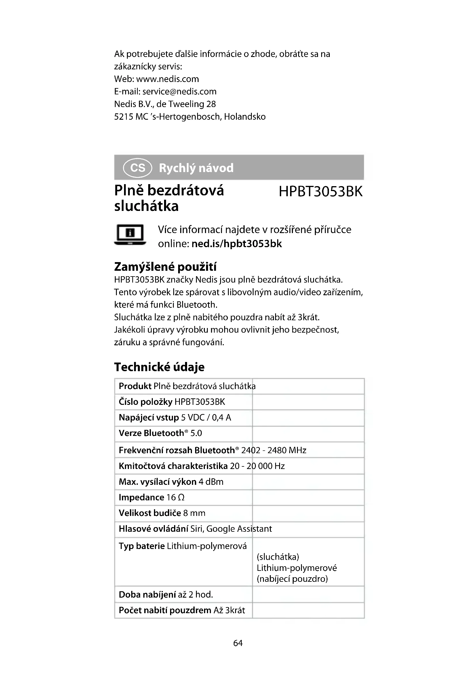Najděte návod k zařízení zdarma HPBT3053BK NEDIS ve formátu PDF.