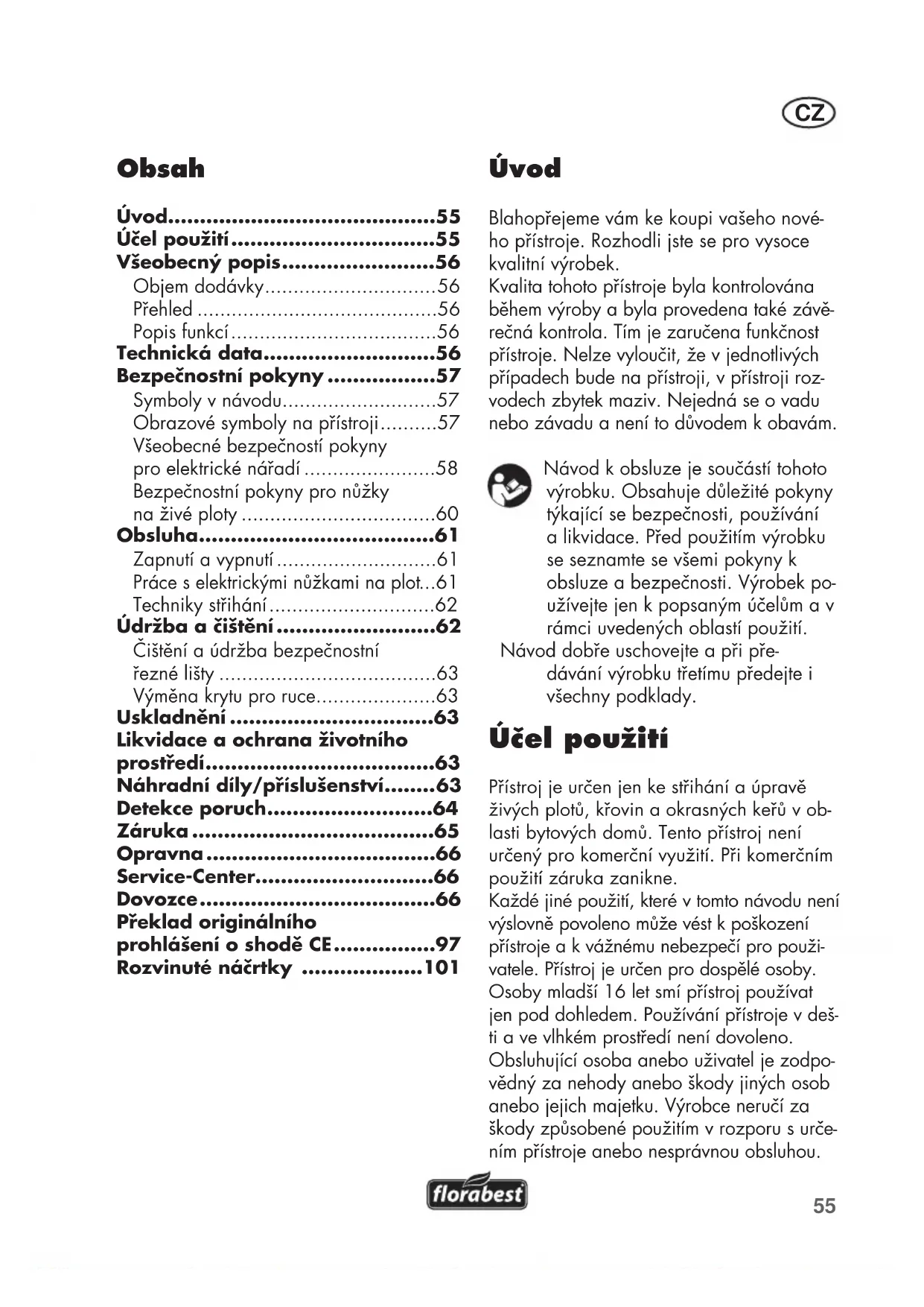 Úvod Blahopřejeme vám ke koupi vašeho nové- ho přístroje. Rozhodli jste se pro vysoce kvalitní výrobek. Kvalita tohoto přístroje byla kontrolována během výroby a byla provedena také závě- rečná kontrola. Tím je zaručena funkčnost přístroje. Nelze vyloučit, že v jednotlivých případech bude na přístroji, v přístroji roz- vodech zbytek maziv. Nejedná se o vadu nebo závadu a není to důvodem k obavám. Návod k obsluze je součástí tohoto výrobku. Obsahuje důležité pokyny týkající se bezpečnosti, používání a likvidace. Před použitím výrobku se seznamte se všemi pokyny k obsluze a bezpečnosti. Výrobek po- užívejte jen k popsaným účelům a v rámci uvedených oblastí použití. Návod dobře uschovejte a při pře- dávání výrobku třetímu předejte i všechny podklady. Účel použití Přístroj je určen jen ke střihání a úpravě živých plotů, křovin a okrasných keřů v ob-lasti bytových domů. Tento přístroj není určený pro komerční využití. Při komerčním použití záruka zanikne. Každé jiné použití, které v tomto návodu není výslovně povoleno může vést k poškození přístroje a k vážnému nebezpečí pro použi-vatele. Přístroj je určen pro dospělé osoby. Osoby mladší 16 let smí přístroj používat jen pod dohledem. Používání přístroje v deš-ti a ve vlhkém prostředí není dovoleno. Obsluhující osoba anebo uživatel je zodpo- vědný za nehody anebo škody jiných osob anebo jejich majetku. Výrobce neručí za škody způsobené použitím v rozporu s urče- ním přístroje anebo nesprávnou obsluhou. Obsah Úvod..........................................55 Účel použití