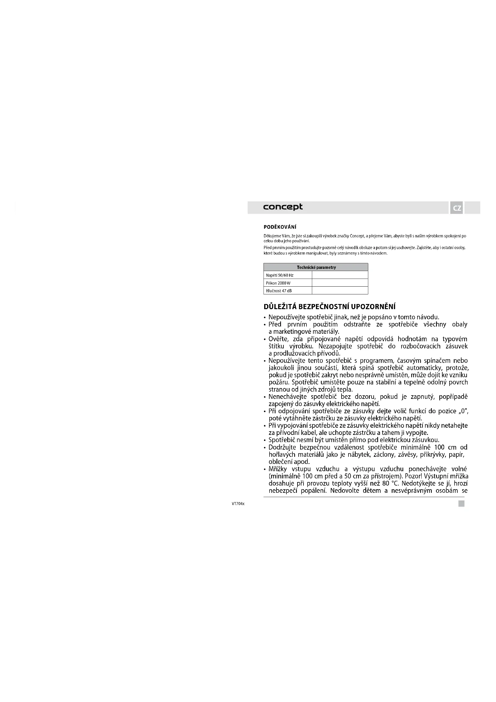 Děkujeme Vám, že jste si zakoupili výrobek značky Concept, a přejeme Vám, abyste byli s naším výrobkem spokojeni po celou dobu jeho používání. Před prvním použitím prostudujte pozorně celý návod k obsluze a potom si jej uschovejte. Zajistěte, aby i ostatní osoby, které budou s výrobkem manipulovat, byly seznámeny s tímto návodem. Technické parametry Napětí 50/60 Hz Příkon 2000 W Hlučnost 47 dB DŮLEŽITÁ BEZPEČNOSTNÍ UPOZORNĚNÍ