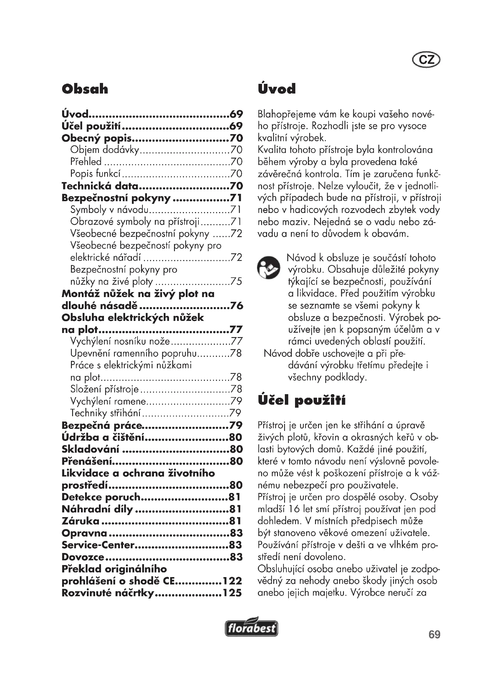 Úvod Blahopřejeme vám ke koupi vašeho nové- ho přístroje. Rozhodli jste se pro vysoce kvalitní výrobek. Kvalita tohoto přístroje byla kontrolována během výroby a byla provedena také závěrečná kontrola. Tím je zaručena funkč- nost přístroje. Nelze vyloučit, že v jednotli- vých případech bude na přístroji, v přístroji nebo v hadicových rozvodech zbytek vody nebo maziv. Nejedná se o vadu nebo zá- vadu a není to důvodem k obavám. Návod k obsluze je součástí tohoto výrobku. Obsahuje důležité pokyny týkající se bezpečnosti, používání a likvidace. Před použitím výrobku se seznamte se všemi pokyny k obsluze a bezpečnosti. Výrobek po- užívejte jen k popsaným účelům a v rámci uvedených oblastí použití. Návod dobře uschovejte a při pře- dávání výrobku třetímu předejte i všechny podklady. Účel použití Přístroj je určen jen ke střihání a úpravě živých plotů, křovin a okrasných keřů v ob- lasti bytových domů. Každé jiné použití, které v tomto návodu není výslovně povole- no může vést k poškození přístroje a k váž- nému nebezpečí pro použivatele. Přístroj je určen pro dospělé osoby. Osoby mladší 16 let smí přístroj používat jen pod dohledem. V místních předpisech může být stanoveno věkové omezení uživatele. Používání přístroje v dešti a ve vlhkém pro- středí není dovoleno. Obsluhující osoba anebo uživatel je zodpo- vědný za nehody anebo škody jiných osob anebo jejich majetku. Výrobce neručí za Obsah Úvod..........................................69 Účel použití
