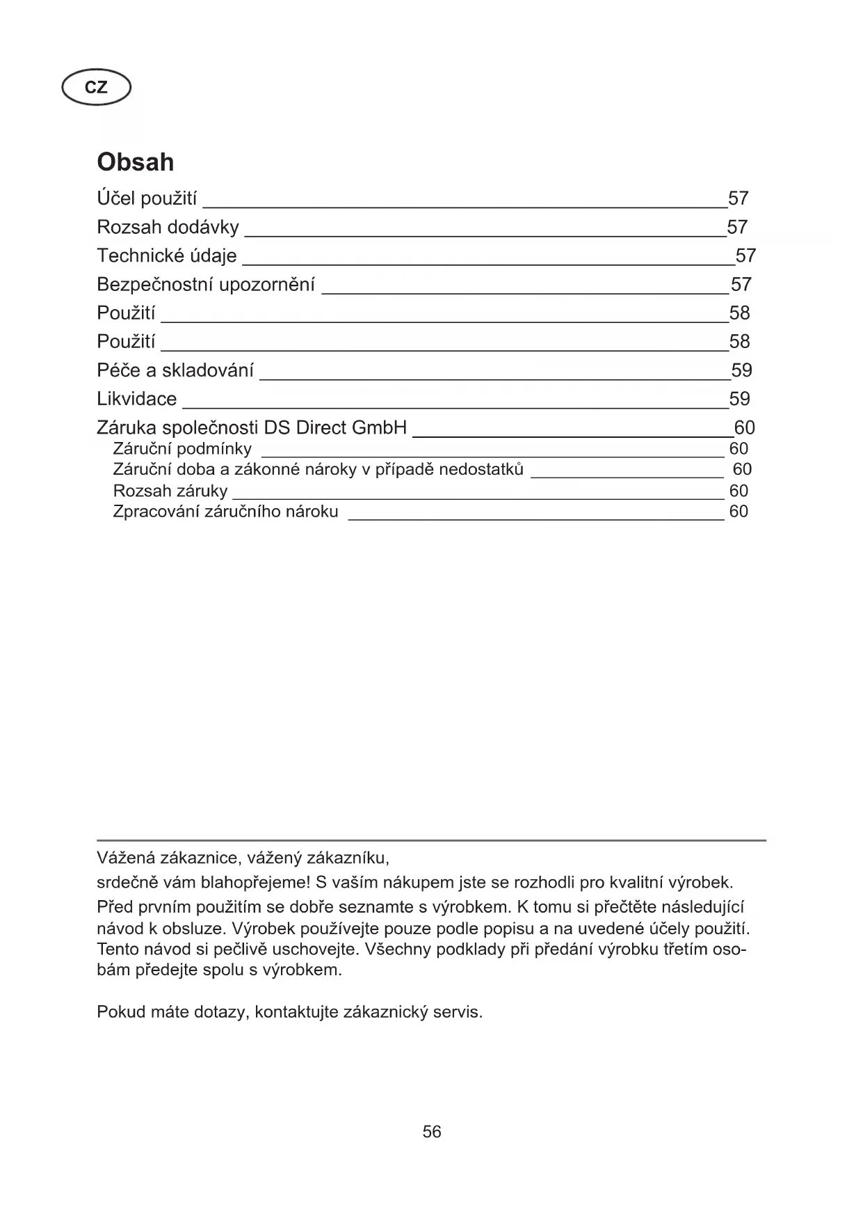 - Στη συνέχεια μπορείτε να στείλετε το ελαττωματικό προϊόν, την απόδειξη πληρωμής (τιμολόγιο) και την περιγραφή του ελαττώματος με αναφορά στο χρόνο εμφάνισής του, στην αναφερόμενη διεύθυνση σέρβις, χωρίς να πληρώσετε ταχυδρομικά τέλη.5556 Vážená zákaznice, vážený zákazníku, srdečně vám blahopřejeme! S vaším nákupem jste se rozhodli pro kvalitní výrobek. Před prvním použitím se dobře seznamte s výrobkem. K tomu si přečtěte následující návod k obsluze. Výrobek používejte pouze podle popisu a na uvedené účely použití. Tento návod si pečlivě uschovejte. Všechny podklady při předání výrobku třetím oso- bám předejte spolu s výrobkem. Pokud máte dotazy, kontaktujte zákaznický servis.