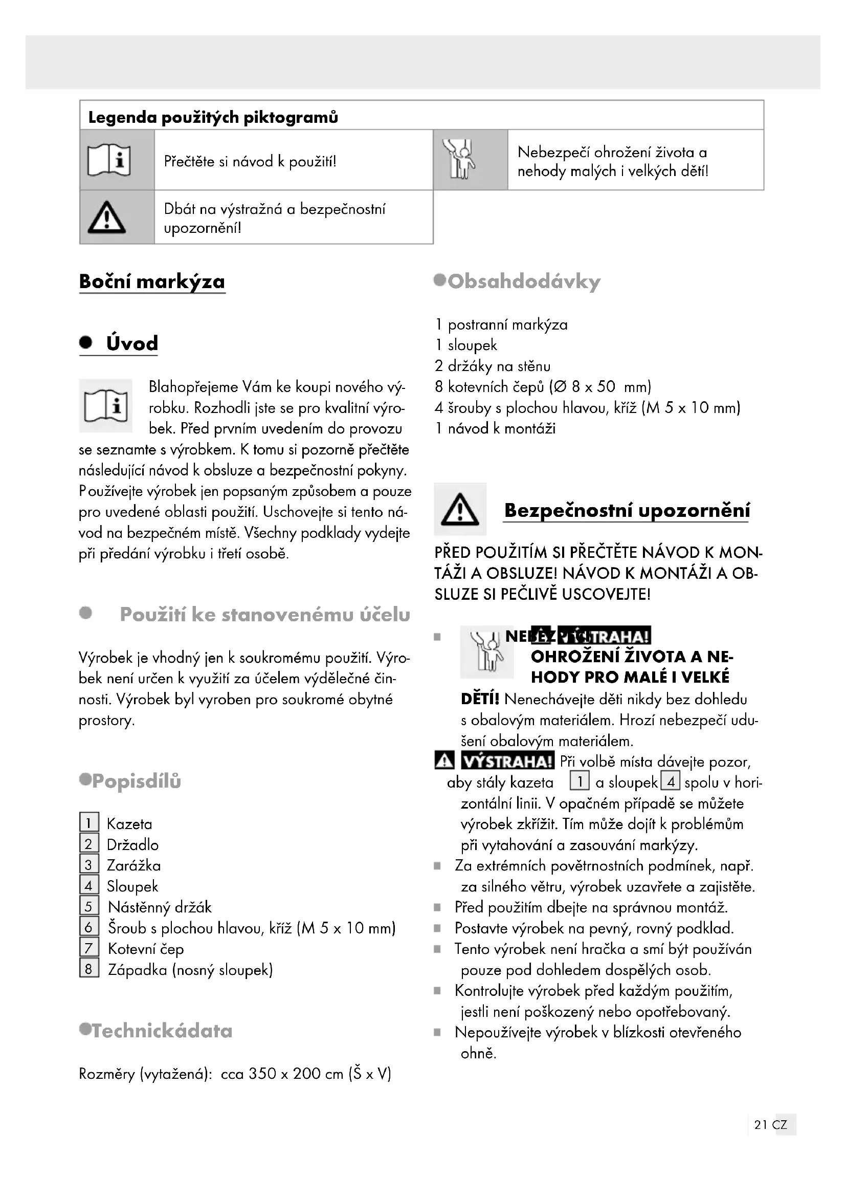 Západka (nosný sloupek) Technická data Rozměry (vytažená): cca 350 x 200 cm (Š x V) Obsah dodávky 1 postranní markýza 1 sloupek 2 držáky na stěnu 8 kotevních čepů (Ø 8 x 50 mm) 4 šrouby s plochou hlavou, kříž (M 5 x 10 mm) 1 návod k montáži Bezpečnostní upozornění PŘED POUŽITÍM SI PŘEČTĚTE NÁVOD K MON- TÁŽI A OBSLUZE! NÁVOD K MONTÁŽI A OB- SLUZE SI PEČLIVĚ USCOVEJTE! NEBEZPEČÍ