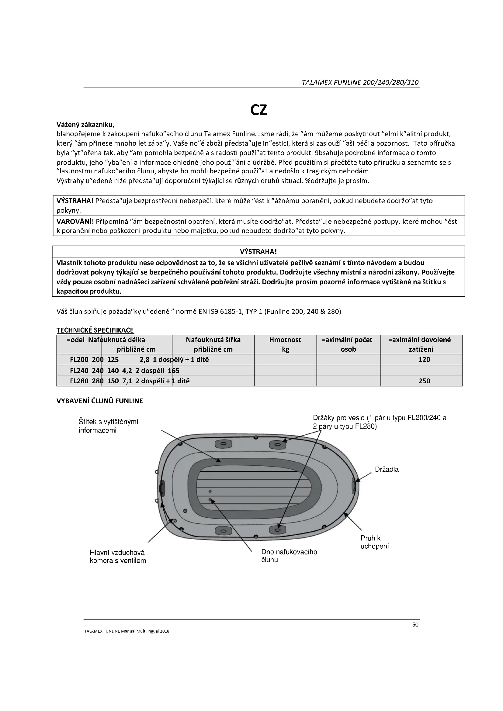 Vážený zákazníku, blahopřejeme k zakoupení nafukovacího člunu Talamex Funline. Jsme rádi, že vám můžeme poskytnout velmi kvalitní produkt, který vám přinese mnoho let zábavy. Vaše nové zboží představuje investici, která si zaslouží vaši péči a pozornost. Tato příručka byla vytvořena tak, aby vám pomohla bezpečně a s radostí používat tento produkt. Obsahuje podrobné informace o tomto produktu, jeho vybavení a informace ohledně jeho používání a údržbě. Před použitím si přečtěte tuto příručku a seznamte se s vlastnostmi nafukovacího člunu, abyste ho mohli bezpečně používat a nedošlo k tragickým nehodám. Výstrahy uvedené níže představují doporučení týkající se různých druhů situací. Dodržujte je prosím. VÝSTRAHA! Představuje bezprostřední nebezpečí, které může vést k vážnému poranění, pokud nebudete dodržovat tyto pokyny. VAROVÁNÍ! Připomíná vám bezpečnostní opatření, která musíte dodržovat. Představuje nebezpečné postupy, které mohou vést k poranění nebo poškození produktu nebo majetku, pokud nebudete dodržovat tyto pokyny. VÝSTRAHA! Vlastník tohoto produktu nese odpovědnost za to, že se všichni uživatelé pečlivě seznámí s tímto návodem a budou dodržovat pokyny týkající se bezpečného používání tohoto produktu. Dodržujte všechny místní a národní zákony. Používejte vždy pouze osobní nadnášecí zařízení schválené pobřežní stráží. Dodržujte prosím pozorně informace vytištěné na štítku s kapacitou produktu. Váš člun splňuje požadavky uvedené v normě EN ISO 6185-1, TYP 1 (Funline 200, 240 & 280) TECHNICKÉ SPECIFIKACE Model Nafouknutá délka přibližně cm Nafouknutá šířka přibližně cm Hmotnost