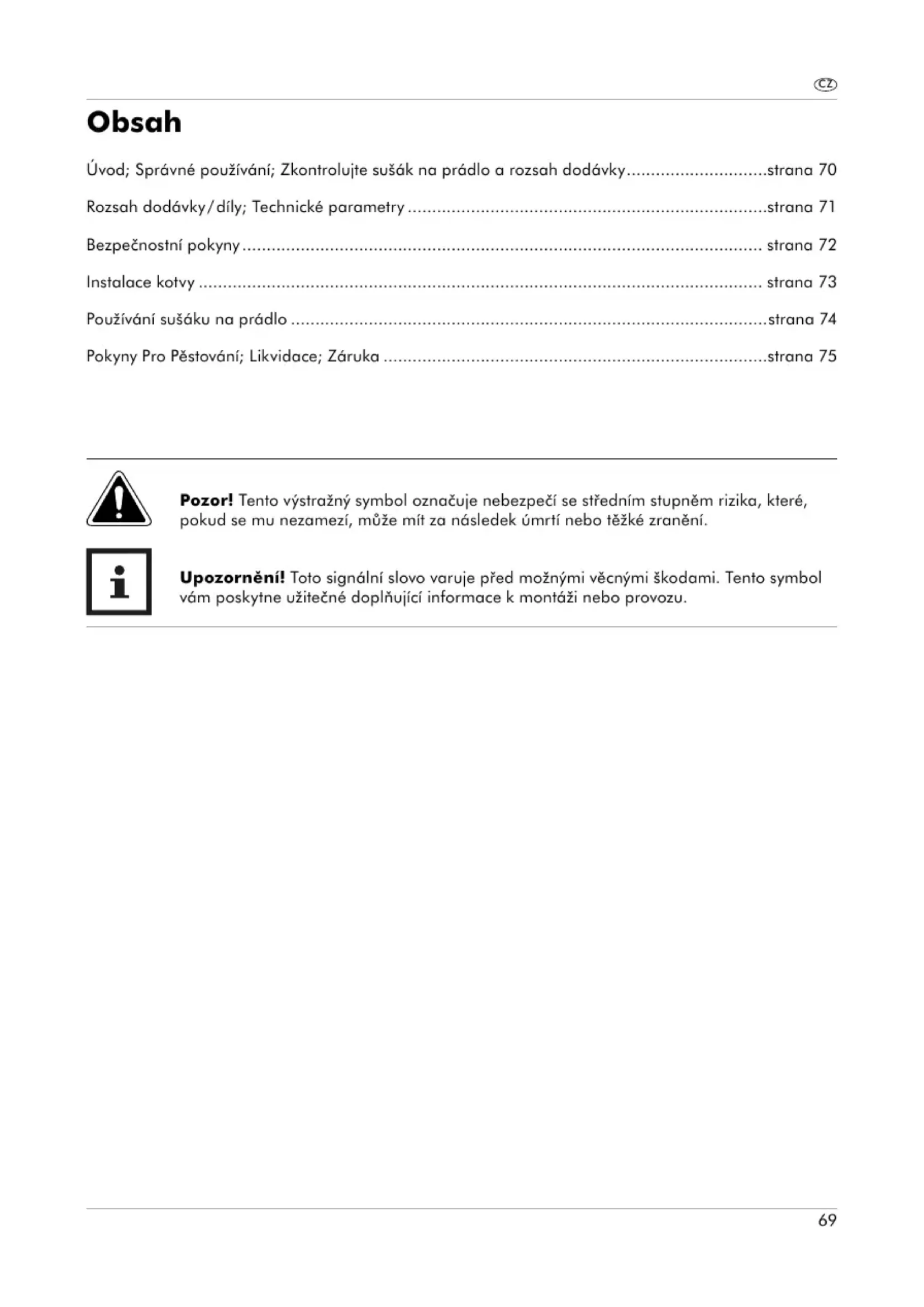 Obsah Úvod; Správné používání; Zkontrolujte sušák na prádlo a rozsah dodávky .............................strana 70 Rozsah dodávky / díly; Technické parametry ..........................................................................strana 71 Bezpečnostní pokyny ........................................................................................................... strana 72 Instalace kotvy .................................................................................................................... strana 73 Používání sušáku na prádlo ..................................................................................................strana 74 Pokyny Pro Pěstování; Likvidace; Záruka ...............................................................................strana 75 Pozor! Tento výstražný symbol označuje nebezpečí se středním stupněm rizika, které, pokud se mu nezamezí, může mít za následek úmrtí nebo těžké zranění. Upozornění! Toto signální slovo varuje před možnými věcnými škodami. Tento symbol vám poskytne užitečné doplňující informace k montáži nebo provozu.70 Úvod Srdečně vám blahopřejeme! Touto koupí jste se rozhodli pro kvalitní výrobek. Před montáží a prvním uvedením do provozu se seznamte s výrobkem. Tento návod k použití patří k tomuto hliníkovému sušáku na prádlo. Obsahuje důležité informace o jeho sestavování a používání. Ke zvýšení srozumitelnosti bude hliníkový sušák na prádlo dále nazýván jen „sušák na prádlo“. Před použitím sušáku na prádlo si pozorně přečtěte návod k použití, zejména bezpečnostní pokyny. Nedodržování tohoto návodu k použití může vést k těžkému poranění nebo poškození sušáku na prádlo. Návod k použití se opírá o normy a ustanovení platné v zemích Evropské unie. Na území mimo EU také dodržujte místní směrnice a zákony. Návod k použití uschovejte pro další použití. Budete-li sušák na prádlo předávat další osobě, bezpodmínečně přiložte i tento návod k použití. Správné používání