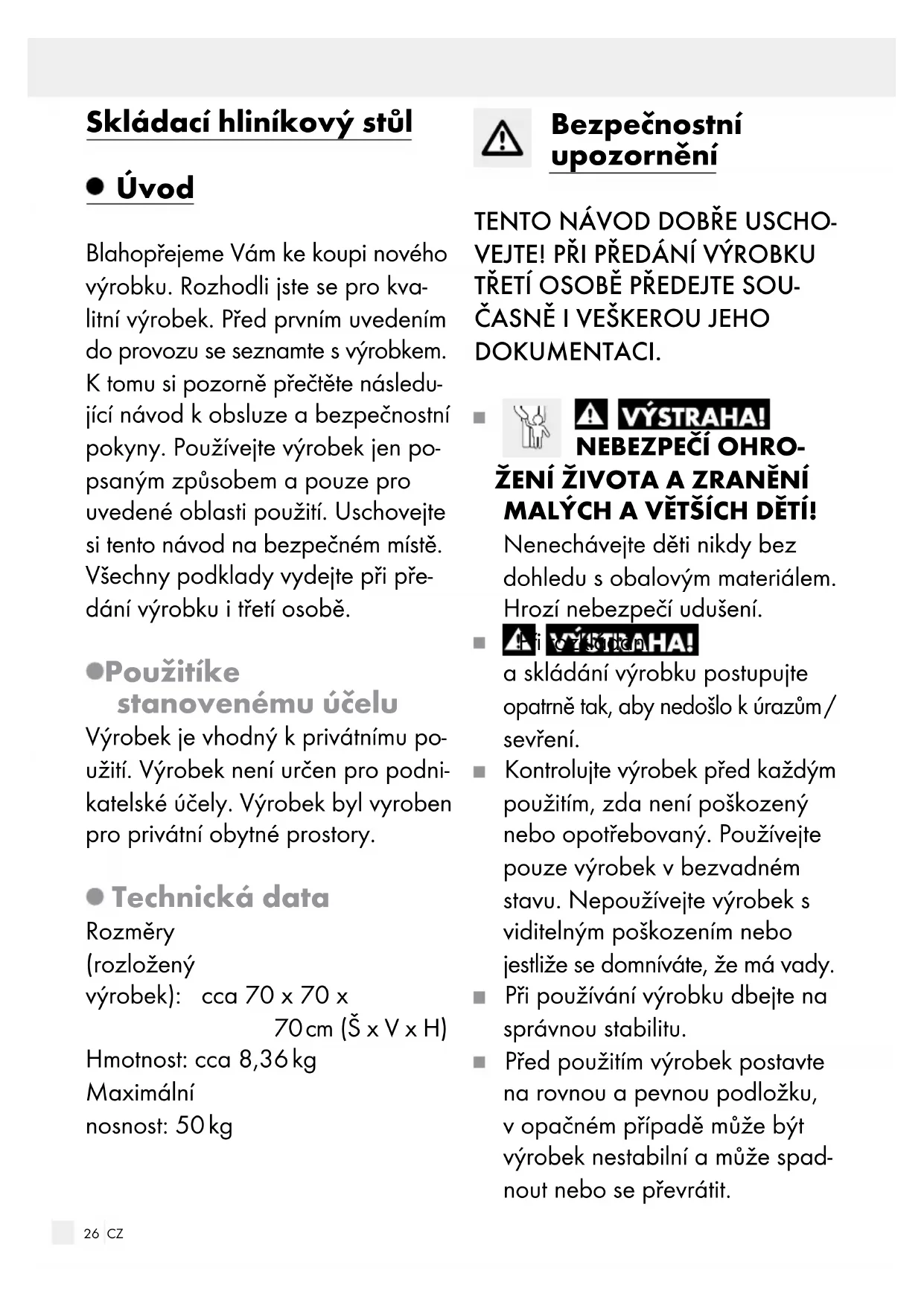 ŠKOD! Neručíme za nehody způsobené nerespektováním bezpečnostních pokynů nebo nesprávným zacházením. Čistění a ošetřování Výrobek čistěte vlhkou utěrkou a mírným čisticím prostředkem. Než výrobek opět zabalíte, nechte všechny díly důkladně uschnout. Zabráníte tím tvoření plísně, zápachů a zabarvení. Skladování Skladujte výrobek vsuché chráněné místnosti. Výrobek skladujte vždy suchý a čistý za pokojové teploty. Zlikvidování Obal se skládá zekologických materiálů, které můžete zlikvidovat prostřednictvím místních sběren recyklovatelných materiálů. O možnostech likvidace vyslouži- lých zařízení se informujte u správy vaší obce nebo města.28 CZ Záruka Výrobek byl vyroben s nejvyšší peč- livostí podle přísných kvalitativních směrnic a před odesláním prošel výstupní kontrolou. V případě závad máte možnost uplatnění zákonných práv vůči prodejci. Vaše práva ze zákona nejsou omezena naší níže uvedenou zárukou. Na tento artikl platí 3 záruka od data zakoupení. Záruční lhůta za- číná od data zakoupení. Uscho- vejte si dobře originál pokladní stvrzenky. Tuto stvrzenku budete po- třebovat jako doklad o zakoupení. Pokud se do 3 let od data zakou- pení tohoto výrobku vyskytne vada materiálu nebo výrobní vada, výro- bek Vám – dle našeho rozhodnutí – bezplatně opravíme nebo vymě- níme. Tato záruka zaniká, jestliže se výrobek poškodí, neodborně použil nebo neobdržel pravidelnou údržbu. Záruka platí na vady materiálu a výrobní vady. Tato záruka se ne- vztahuje na díly výrobku podléha- jící opotřebení (např. na baterie), dále na poškození křehkých, chou- lostivých dílů, např. vypínačů, akumulátorů nebo dílů zhotove- ných ze skla. Postup v případě uplatňování záruky Pro zajištění rychlého zpracování Vašeho případu se řiďte následují- cími pokyny: Pro všechny požadavky si připravte pokladní stvrzenku a číslo artiklu (např. IAN 123456_7890) jako doklad o zakoupení. Číslo artiklu najdete na typovém štítku, gravuře, titulní stránce návodu (vlevo dole) nebo na nálepce na zadní nebo spodní straně. V případě poruch funkce nebo jiných závad nejdříve kontaktujte, telefo- nicky nebo e-mailem, v následujícím textu uvedené servisní oddělení. Výrobek registrovaný jako vadný potom můžete s přiloženým dokla- dem o zakoupení (pokladní stvr- zenkou) a údaji k závadě a kdy k ní došlo, bezplatně zaslat na adresu servisu, která Vám byla sdělena. Servis Servis Česká republika Tel.: 800600632 E-Mail: owim@lidl.cz29 SK Hliníkový skladací stôl Úvod Blahoželáme Vám ku kúpe Vášho nového výrobku. Kúpou ste sa roz- hodli pre vysoko kvalitný produkt. Pred prvým uvedením do prevádzky sa oboznámte s výrobkom. Za týmto účelom si pozorne prečítajte nasledujúci návod na obsluhu a bez pečnostné pokyny. Výrobok použí- vajte iba v súlade s popisom a v uvedených oblastiach používania. Tento návod uschovajte na bezpeč- nom mieste. Ak výrobok odovzdáte ďalšej osobe, priložte k nemu aj všetky podklady. Používanie v súlade s určeným účelom Výrobok je vhodný pre súkromnú oblasť. Výrobok nie je určený na komerčné účely. Výrobok bol vyro- bený pre súkromné obytné oblasti. Technické údaje Rozmery (rozložené): cca. 70 x 70 x 70 cm (š x v x h) Hmotnosť: cca. 8,36 kg Max. zaťaženie: 50 kg Bezpečnostné upozornenia