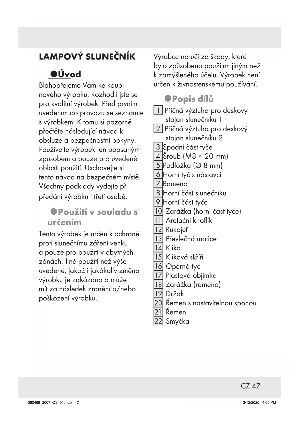 Úvod Blahopřejeme Vám ke koupi nového výrobku. Rozhodli jste se pro kvalitní výrobek. Před prvním uvedením do provozu se seznamte s výrobkem. K tomu si pozorně přečtěte následující návod k obsluze a bezpečnostní pokyny. Používejte výrobek jen popsaným způsobem a pouze pro uvedené oblasti použití. Uschovejte si tento návod na bezpečném místě. Všechny podklady vydejte při předání výrobku i třetí osobě. Použití v souladu s určením Tento výrobek je určen k ochraně proti slunečnímu záření venku a pouze pro použití v obytných zónách. Jiné použití než výše uvedené, jakož i jakákoliv změna výrobku je zakázána a může mít za následek zranění a/nebo poškození výrobku. Výrobce neručí za škody, které bylo způsobeno použitím jiným než k zamýšleného účelu. Výrobek není určen k živnostenskému používání. Popis dílů [1] Příčná výztuha pro deskový stojan slunečníku 1 [2] Příčná výztuha pro deskový stojan slunečníku 2 [3] Spodní část tyče [4] Šroub (M8 × 20mm) [5] Podložka (Ø 8mm) [6] Horní tyč s nástavci [7] Rameno [8] Horní část slunečníku [9] Horní část tyče
