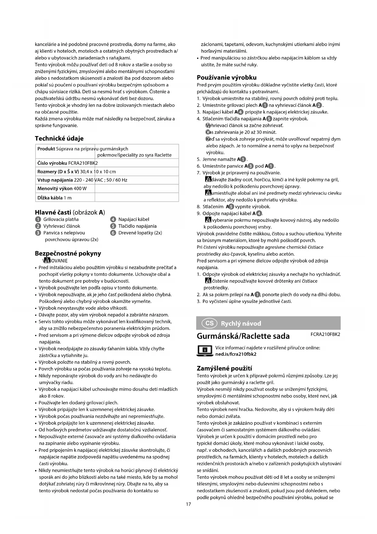 Rychlý návod Gurmánská/Raclette sada FCRA210FBK2Více informací najdete v rozšířené příručce online: ned.is/fcra210fbk2 Zamýšlené použití Tento výrobek je určen kpřípravě pokrmů různými způsoby. Lze jej použít jako gurmánský araclette gril.Výrobek nesmějí nikdy používat osoby se sníženými fyzickými, smyslovými či mentálními schopnostmi nebo osoby, které neví, jak výrobek obsluhovat.Tento výrobek není hračka. Nedovolte, aby si svýrokem hrály děti nebo domácí zvířata.Tento výrobek je zakázáno používat vkombinaci sexterním časovačem či samostatným systémem dálkového ovládání.Výrobek je určen kpoužití vdomácím prostředí nebo pro typické domácí úkoly, které mohou vykonávat i laické osoby, např. vobchodech, kancelářích adalších podobných pracovních prostředích, na farmách, klienty vhotelech, motelech adalších rezidenčních prostorách a/nebo vzařízeních poskytujících ubytování se snídání.Tento výrobek mohou používat děti od 8 let a osoby se sníženými tělesnými, smyslovými nebo duševními schopnostmi nebo s nedostatkem zkušeností a znalostí, pokud jsou pod dohledem, nebo podle pokynů ohledně bezpečného používání výrobku, pokud se kancelárie a iné podobné pracovné prostredia, domy na farme, ako aj klienti v hoteloch, moteloch aostatných obytných prostrediach a/alebo v ubytovacích zariadeniach s raňajkami.Tento výrobok môžu používať deti od 8 rokov a staršie a osoby so zníženými fyzickými, zmyslovými alebo mentálnymi schopnosťami alebo s nedostatkom skúseností a znalostí iba pod dozorom alebo pokiaľ sú poučení o používaní výrobku bezpečným spôsobom a chápu súvisiace riziká. Deti sa nesmú hrať s výrobkom. Čistenie a používateľskú údržbu nesmú vykonávať deti bez dozoru.Tento výrobok je vhodný len na dobre izolovaných miestach alebo na občasné použitie.Každá zmena výrobku môže mať následky na bezpečnosť, záruku a správne fungovanie. Technické údaje Produkt Súprava na prípravu gurmánskych pokrmov/špeciality zo syra RacletteČíslo výrobku FCRA210FBK2Rozmery (D x Š x V) 30,4 x 10 x 10 cmVstup napájania 220 - 240 VAC ; 50 / 60 HzMenovitý výkon 400 WDĺžka kábla 1 m Hlavné časti (obrázok A) 1 Grilovacia platňa2 Vyhrievací článok3 Panvica s nelepivou povrchovou úpravou (2x)4 Napájací kábel5 Tlačidlo napájania6 Drevené lopatky (2x) Bezpečnostné pokyny
