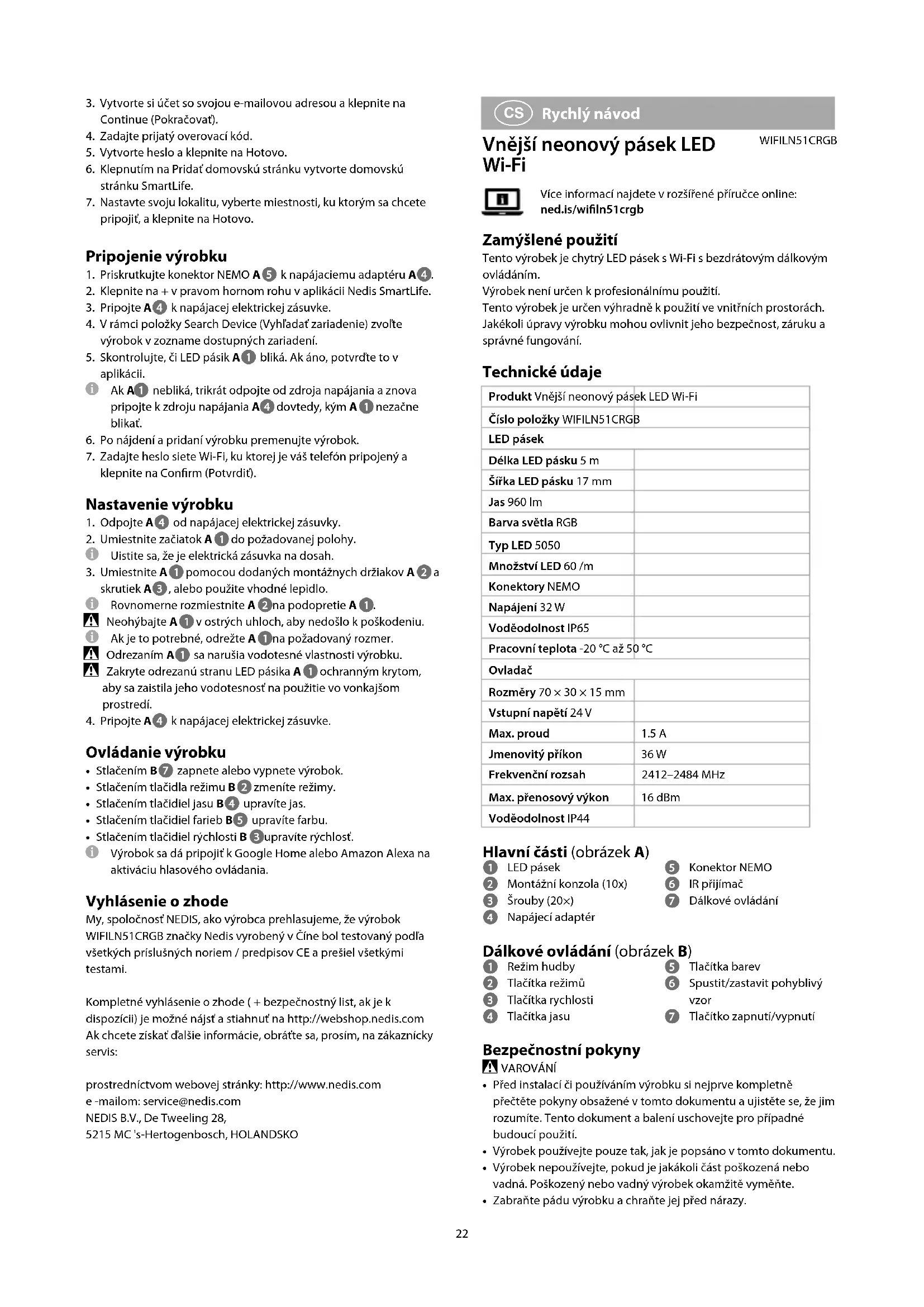 Rychlý návod Vnější neonový pásek LED Wi-Fi WIFILN51CRGBVíce informací najdete v rozšířené příručce online: ned.is/wiln51crgb Zamýšlené použití Tento výrobek je chytrý LED pásek sWi-Fi sbezdrátovým dálkovým ovládáním.Výrobek není určen k profesionálnímu použití.Tento výrobek je určen výhradně k použití ve vnitřních prostorách.Jakékoli úpravy výrobku mohou ovlivnit jeho bezpečnost, záruku a správné fungování. Technické údaje Produkt Vnější neonový pásek LED Wi-FiČíslo položky WIFILN51CRGBLED pásekDélka LED pásku 5 mŠířka LED pásku 17mmJas 960lmBarva světla RGBTyp LED 5050Množství LED 60 /mKonektory NEMONapájení 32 WVoděodolnost IP65Pracovní teplota -20°C až 50°COvladačRozměry 70 × 30 × 15mmVstupní napětí 24 VMax. proud 1.5 AJmenovitý příkon 36 WFrekvenční rozsah 2412–2484MHzMax. přenosový výkon 16 dBmVoděodolnost IP44 Hlavní části (obrázek A) 1 LED pásek2 Montážní konzola (10x)3 Šrouby (20×)4 Napájecí adaptér5 Konektor NEMO6 IR přijímač7 Dálkové ovládání Dálkové ovládání (obrázek B) 1 Režim hudby2 Tlačítka režimů3 Tlačítka rychlosti4 Tlačítka jasu5 Tlačítka barev6 Spustit/zastavit pohyblivý vzor 7 Tlačítko zapnutí/vypnutí Bezpečnostní pokyny
